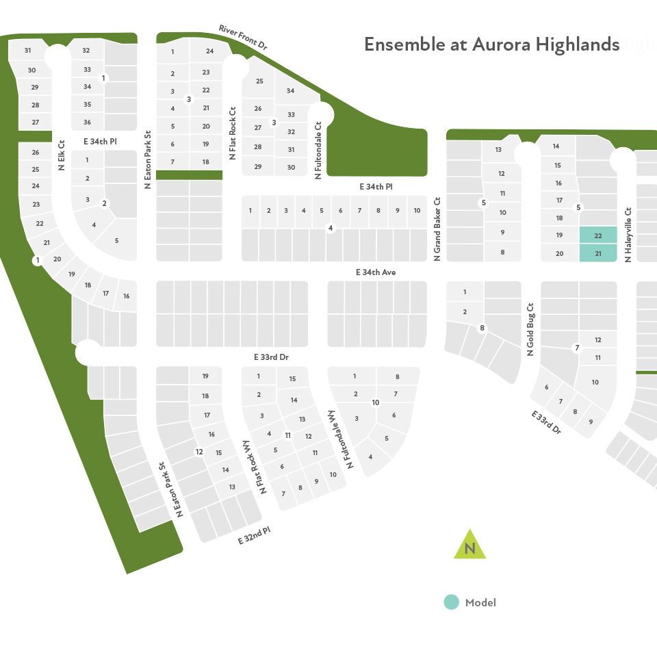 Take Aurora Highlands Pkwy east to Highlands Creek Pkwy and turn right. Take Highlands Creek Pkwy to E 34th Ave and turn right. From E 34th Ave, take your first right onto Haleyville Ct. As you turn onto Haleyville Ct, our New Home Gallery and model homes will be on your left and parking is available on your right.