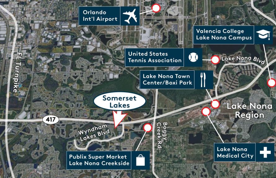 From FL Turnpike: Take exit 249 Osceola Pkwy; Continue Osceola Pkwy, Turn Left on Landstar Blvd; Turn Right on Rhode Island Woods Circle; Turn Right on Wyndham Lakes Blvd, Continue Straight; Turn Right on Lakes Nona Blvd; Welcome to Somerset Lakes. From SR 417 South: Take Exit 17B Boggy Creek Road; Turn Left on State Hwy 527A / Boggy Creek Road; Keep Right to Continue on State Hwy 527A; Turn Left on Lake Nona Blvd; Turn Left on Wyndham Lakes Blvd; Somerset Lakes will be on your Left