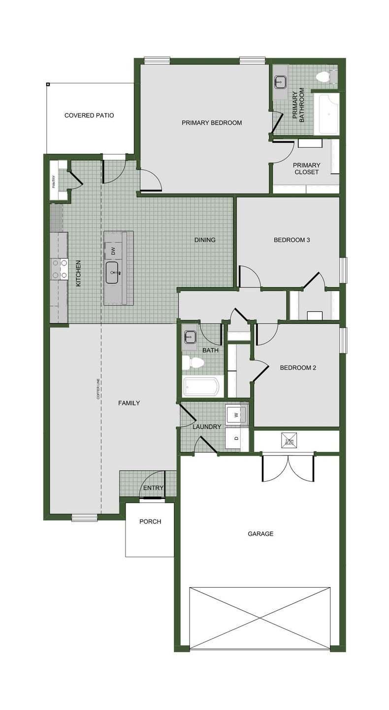Our 1550 square feet, 3 bedroom, 2 bathroom floor plan series features an open living area with dedicated dining space and a single-level kitchen island. The linen closet, large pantry, and oversized closets ensure that you will have all of the storage space your heart desires. Enjoy a secluded primary bedroom with plenty of space and a large walk-in closet.