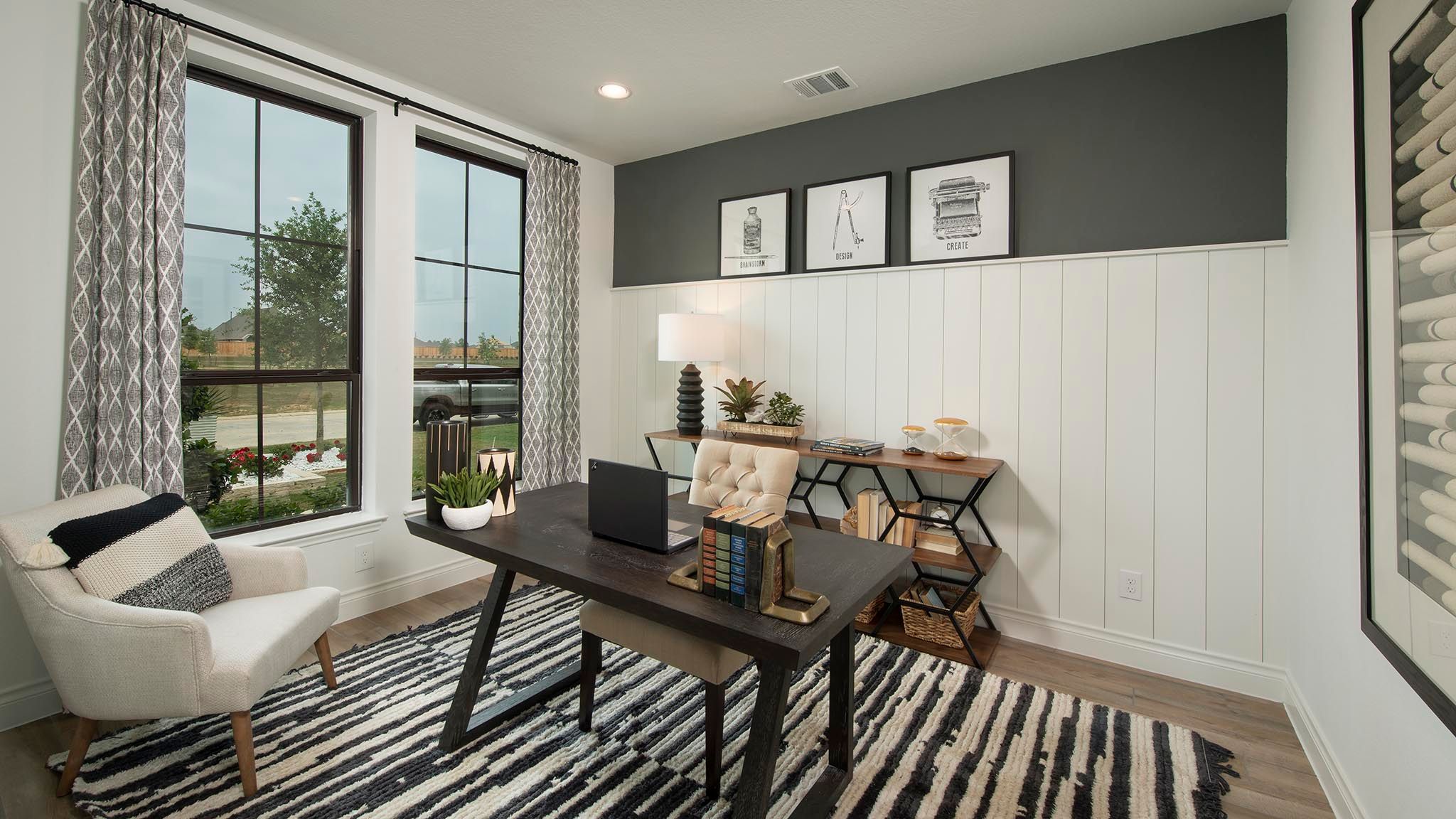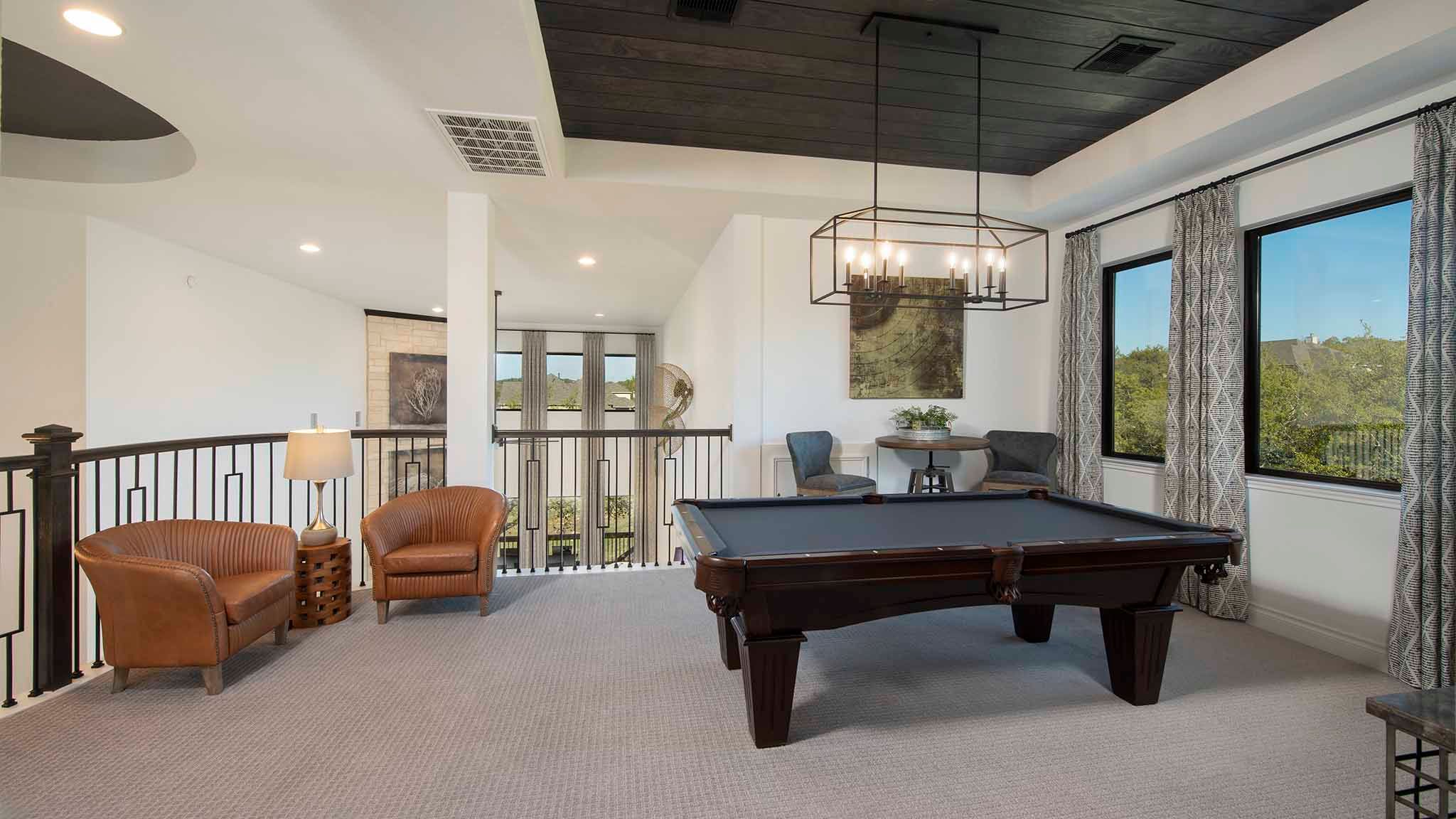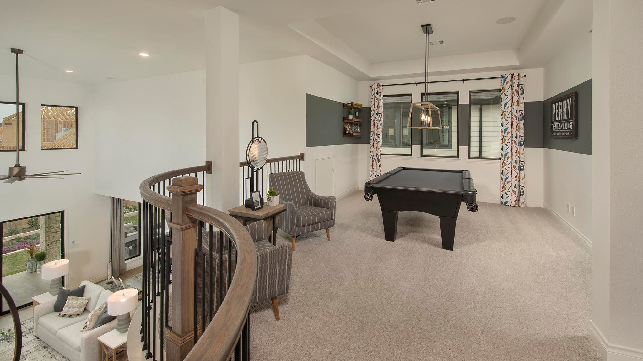 Home office with French doors set at two-story entry. Formal dining room opens to curved staircase. Kitchen and morning area open to two-story family room. Kitchen features generous island with built-in seating space. Family room features wall of windows. Primary bedroom features 12-foot ceiling. Primary bath includes dual vanity, garden tub, separate glass-enclosed shower and oversized walk-in closet with access to utility room. A second bedroom is downstairs. A game room, media room and secondary bedrooms are upstairs. Covered backyard patio. Mud room off three-car garage. Representative Images. Features and specifications may vary by community.