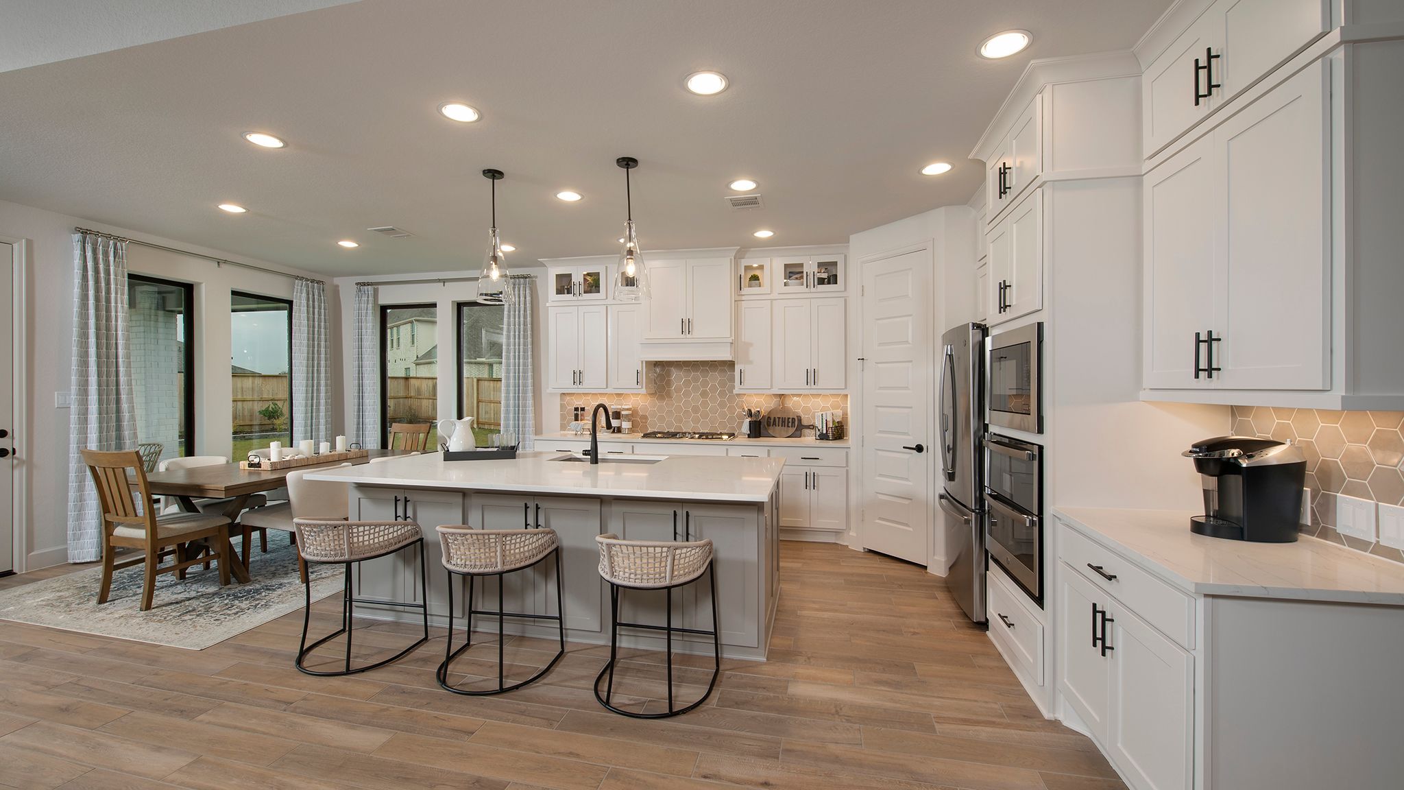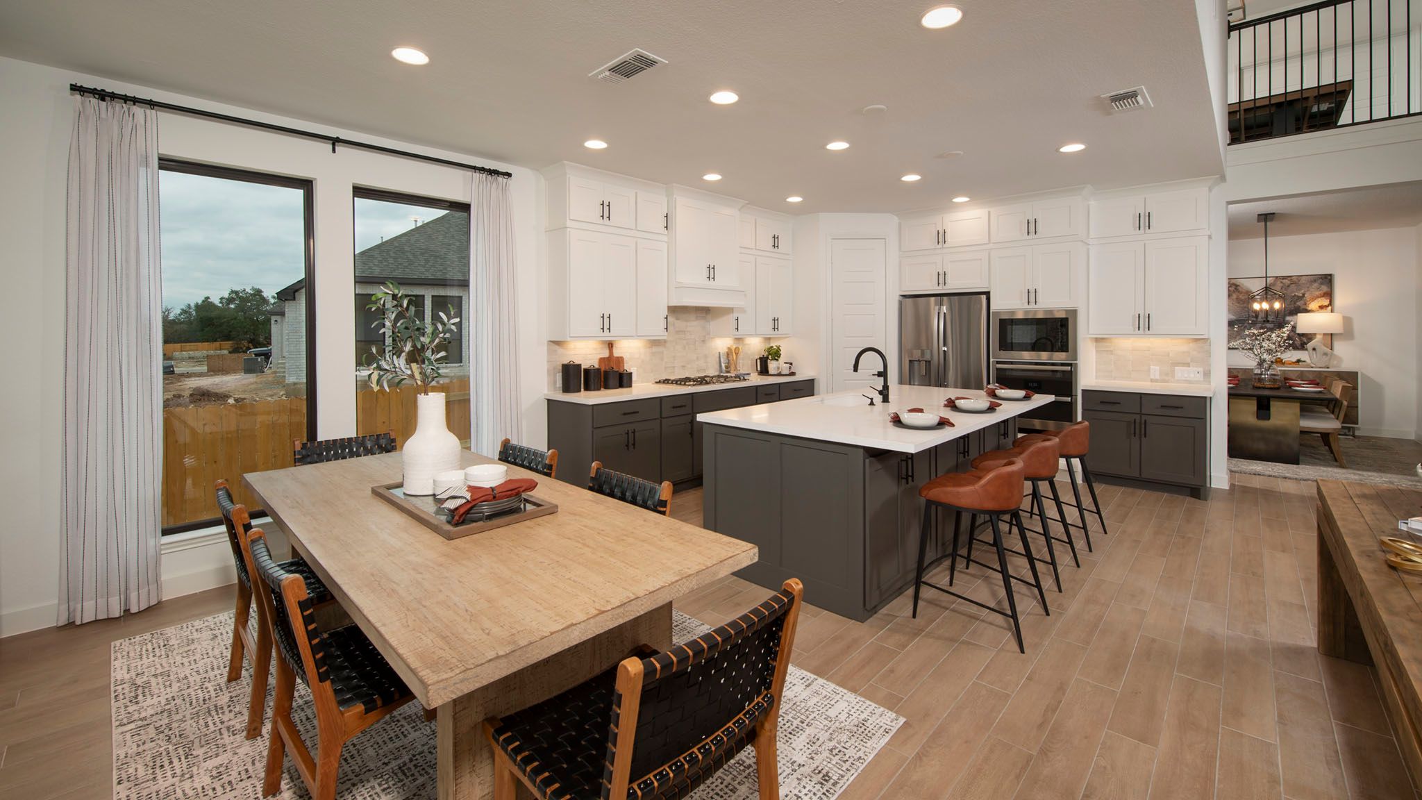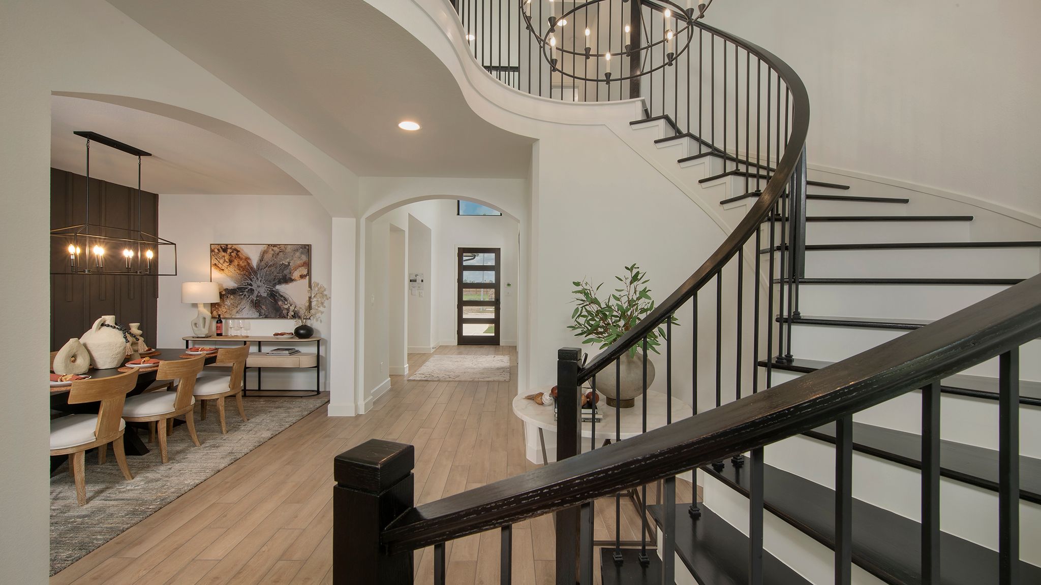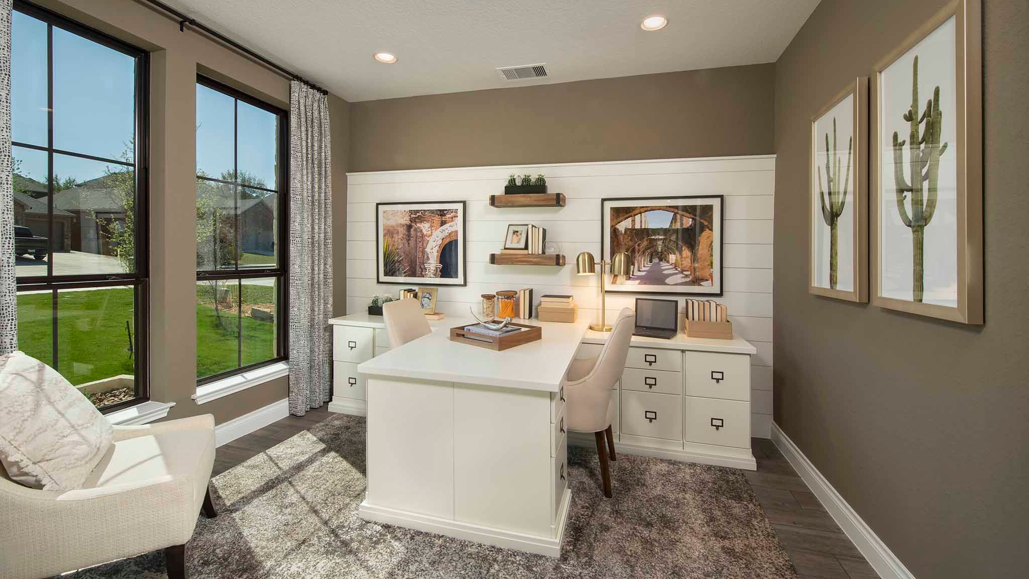 Home office with French doors set at two-story entry. Formal dining room opens to curved staircase. Kitchen and morning area open to two-story family room. Kitchen features generous island with built-in seating space. Family room features wall of windows. Primary bedroom features 12-foot ceiling. Primary bath includes dual vanity, garden tub, separate glass-enclosed shower and oversized walk-in closet with access to utility room. A second bedroom is downstairs. A game room, media room and secondary bedrooms are upstairs. Covered backyard patio. Mud room off three-car garage. Representative Images. Features and specifications may vary by community.