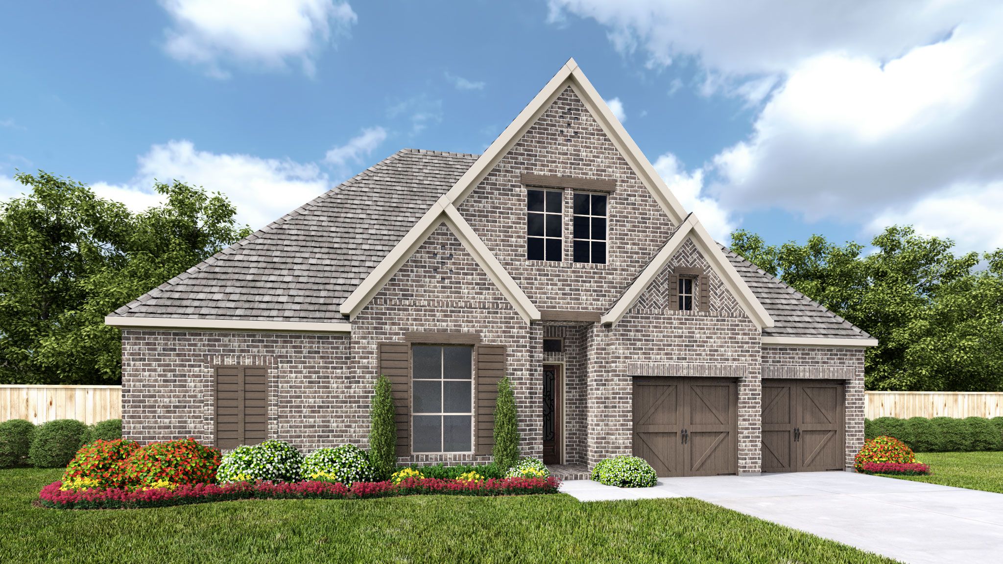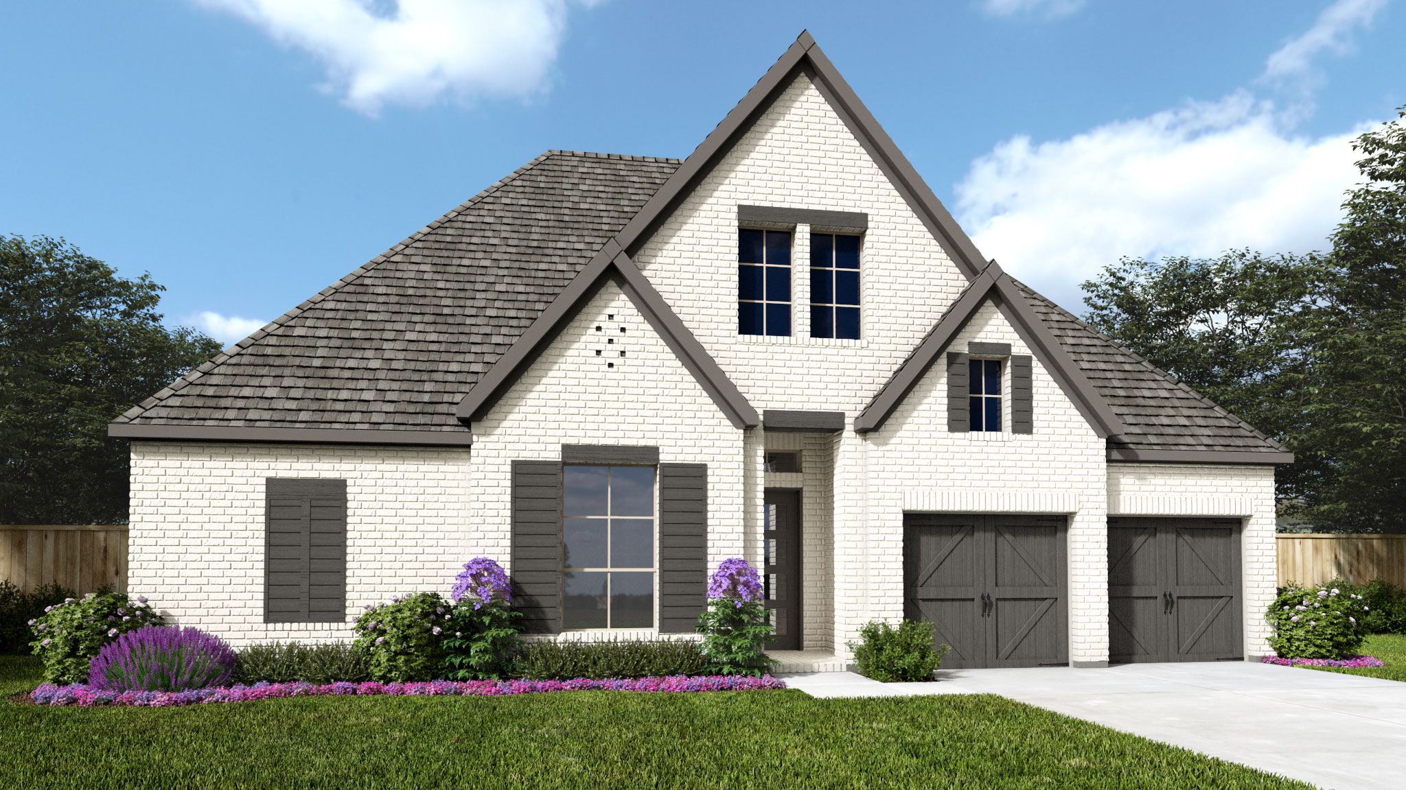 Entry welcomes with 12-foot ceiling. Open family room features wall of windows and a fireplace. Kitchen hosts generous island with built-in seating space. Adjoining dining area features two walls of windows. Game room with French doors just off family room. Primary suite includes bedroom with 14-foot ceiling. Double doors lead to primary bath with dual vanities, a garden tub, separate glass-enclosed shower and two large walk-in closets. A guest suite and Hollywood bath add to this spacious four-bedroom home. Covered backyard patio. Mud room off three-car garage. Representative Images. Features and specifications may vary by community.