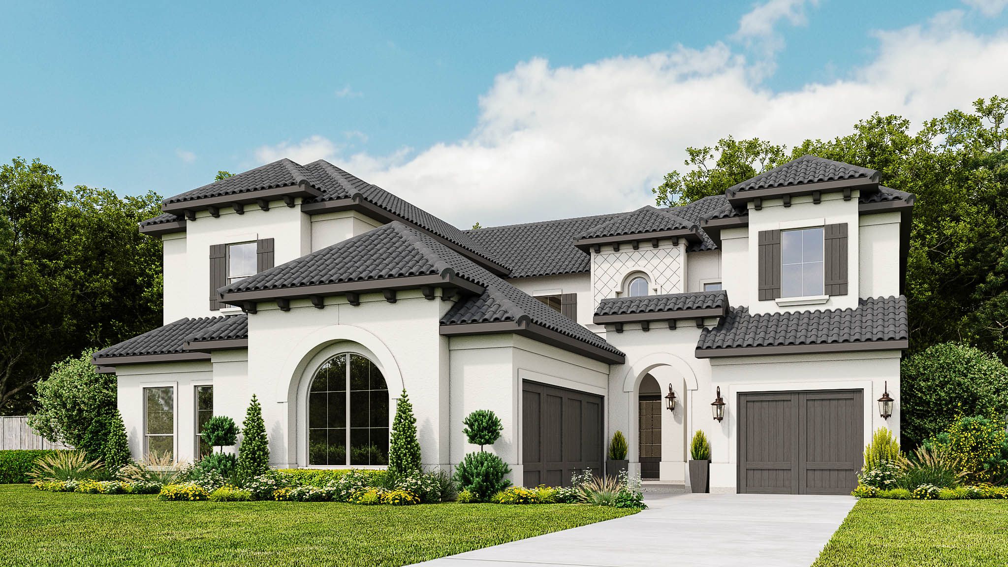 Courtyard leads to the front porch. Entry leads to two-story family room with a fireplace, a wall of windows and a curved staircase. Kitchen features a large island with built-in seating space, large walk-in pantry and a butler's pantry. Large morning area with a wall of windows. Private primary suite features four large windows. Double doors lead to primary bath with dual vanities, freestanding tub, a separate large glass enclosed shower, and two large walk-in closets. Formal dining room. Home office with French doors. Guest suite with a private bathroom and a walk-in closet. Media room with French doors, game room, and secondary bedrooms complete the second level. Covered backyard patio. Two-car garage and a separate single car-garage. Representative Images. Features and specifications m...