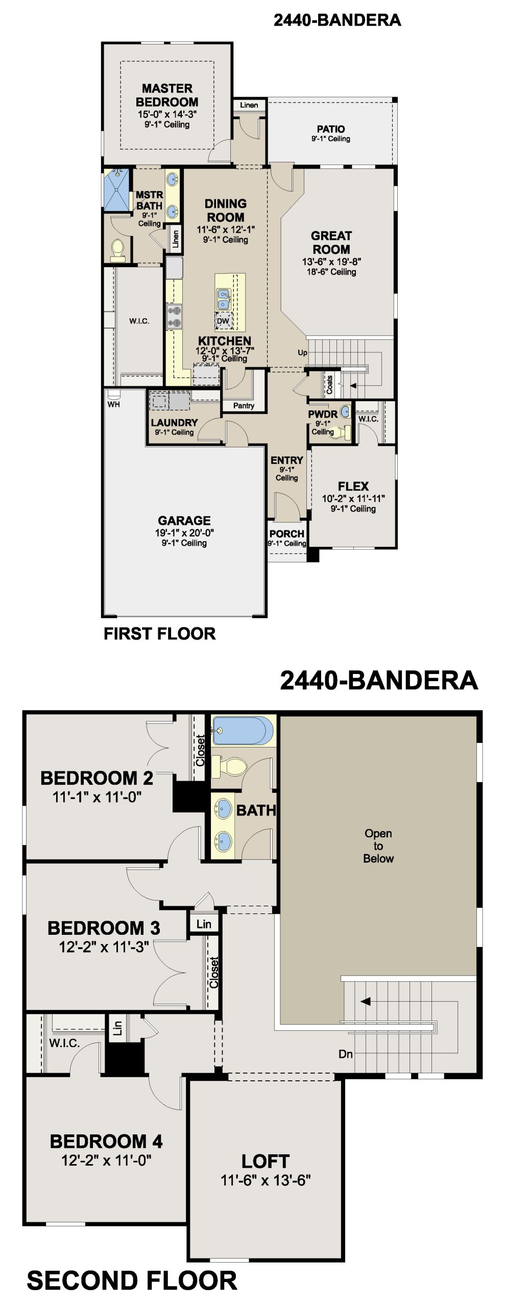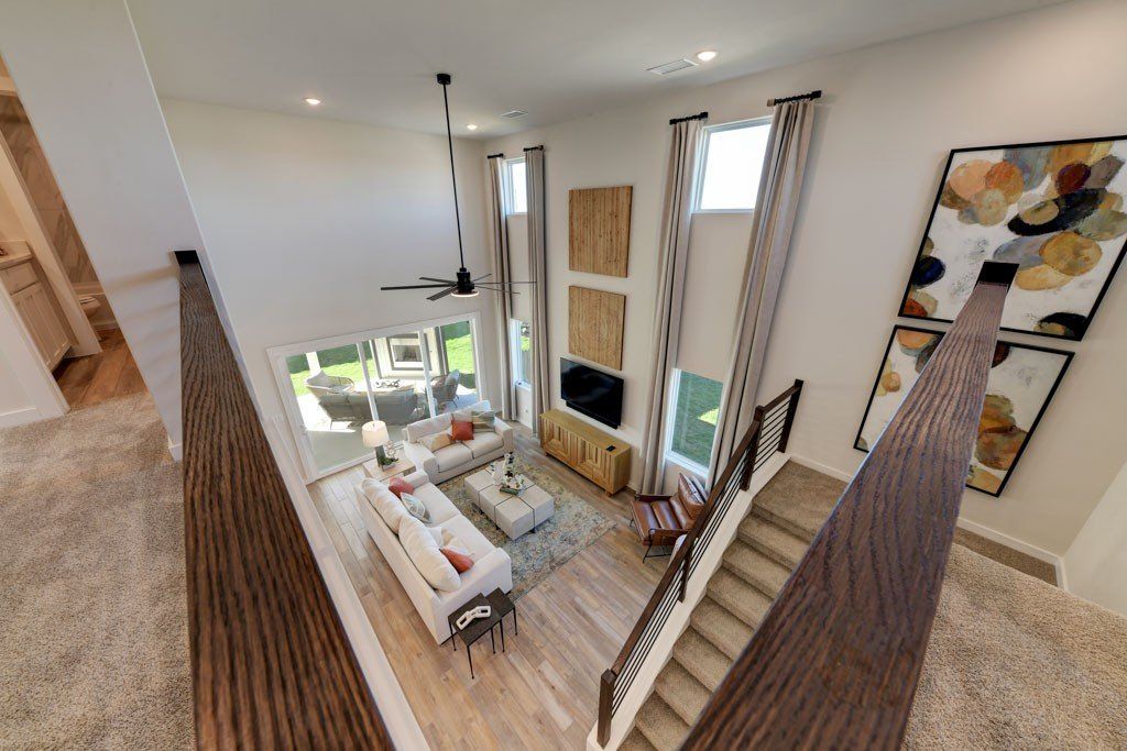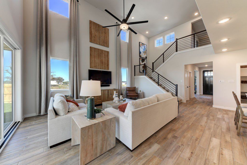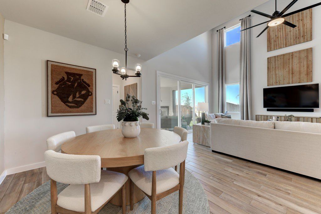 The Bandera is a thoughtfully designed two-story home offering 4 to 6 bedrooms, 2.5 to 3 bathrooms, and 2,440 square feet of well-balanced living space. An open-concept layout connects the kitchen, dining, and living areas, anchored by a gourmet kitchen that supports both everyday living and entertaining. The great room is enhanced by a dramatic 18' ceiling with an open-to-above design, creating a strong sense of space and natural light. The primary suite is conveniently located on the main level, offering added privacy and featuring a bathroom with dual vanities and a walk-in shower. Upstairs, additional bedrooms are complemented by a versatile loft space, while a flex room on the first floor provides added flexibility for a home office, playroom, or additional living area. With a layout...
