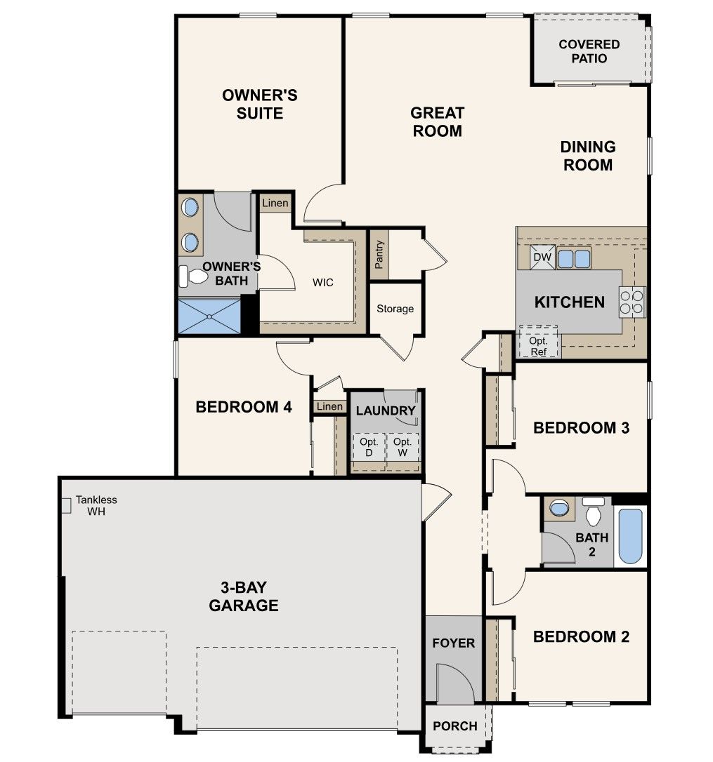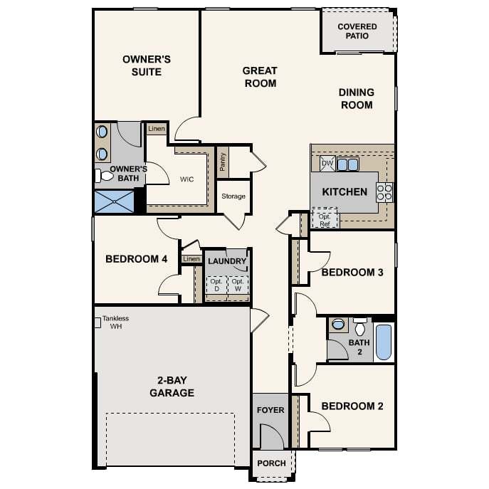 Step into modern style with the Cabot floor plan! This plan offers a spacious open layout with a kitchen with a walk-in pantry flowing into a dining area and a great room with access to a covered patio. Toward the front of the home, two bedrooms flank a bath, and at the back, you’ll find the secluded primary suite, which boasts a walk-in closet with linen storage and a private bath with dual vanities and a walk-in shower. An additional bedroom and a laundry round out this plan.