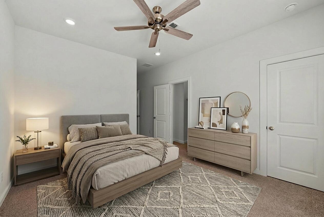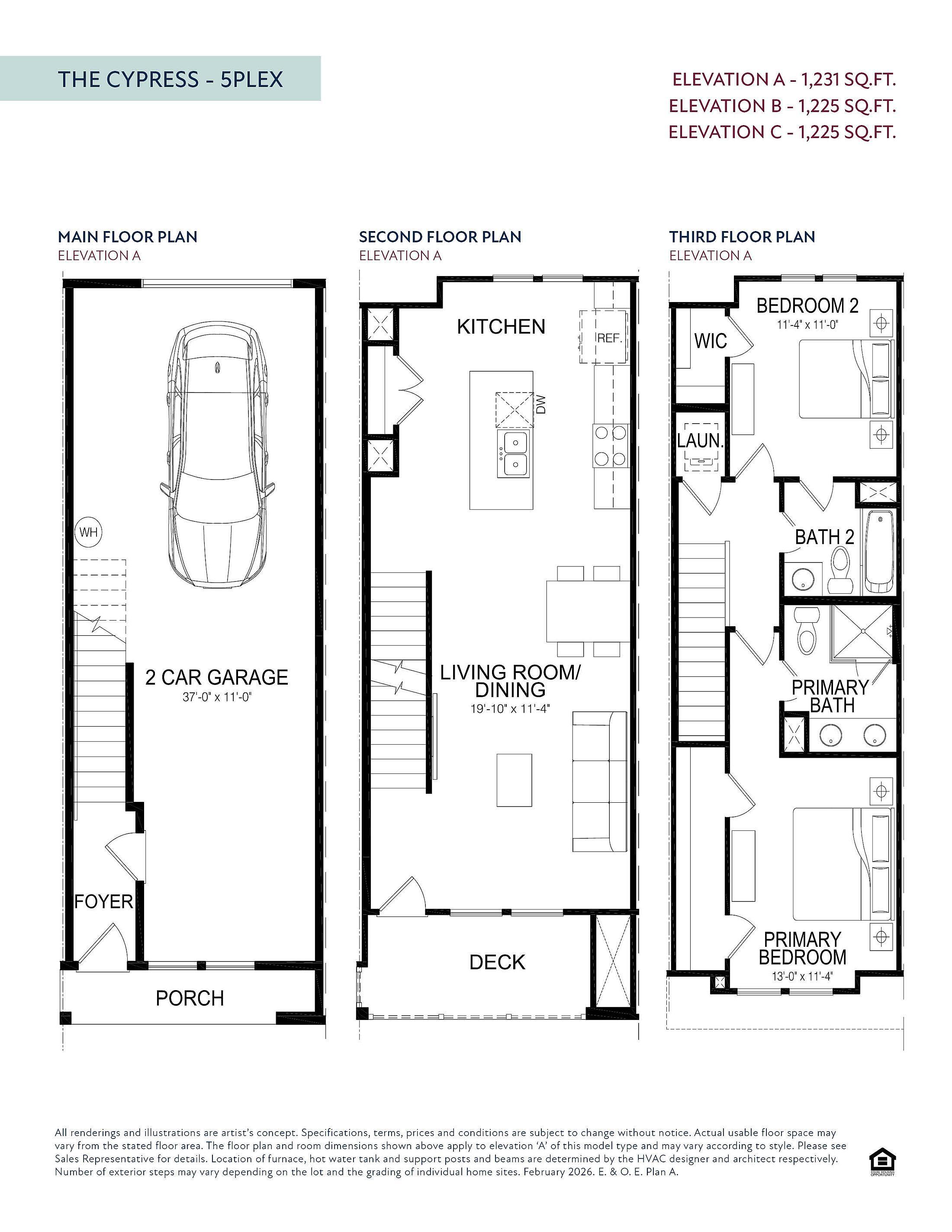 The Cypress floorplan is a smartly designed 1,231 sq. ft. townhome-style layout offering three levels of modern, efficient living. The first floor features a deep two-car garage with extra storage space and a welcoming foyer entry. On the second floor, an open-concept kitchen, living, and dining area creates a bright and flexible space, complete with a private deck for outdoor enjoyment. The top floor includes a well-appointed primary suite with a spacious bath, along with a secondary bedroom featuring its own walk-in closet and adjacent full bath. A conveniently located laundry area adds everyday ease. With its thoughtful layout and contemporary flow, this plan is ideal for those seeking low-maintenance living without sacrificing style or comfort.