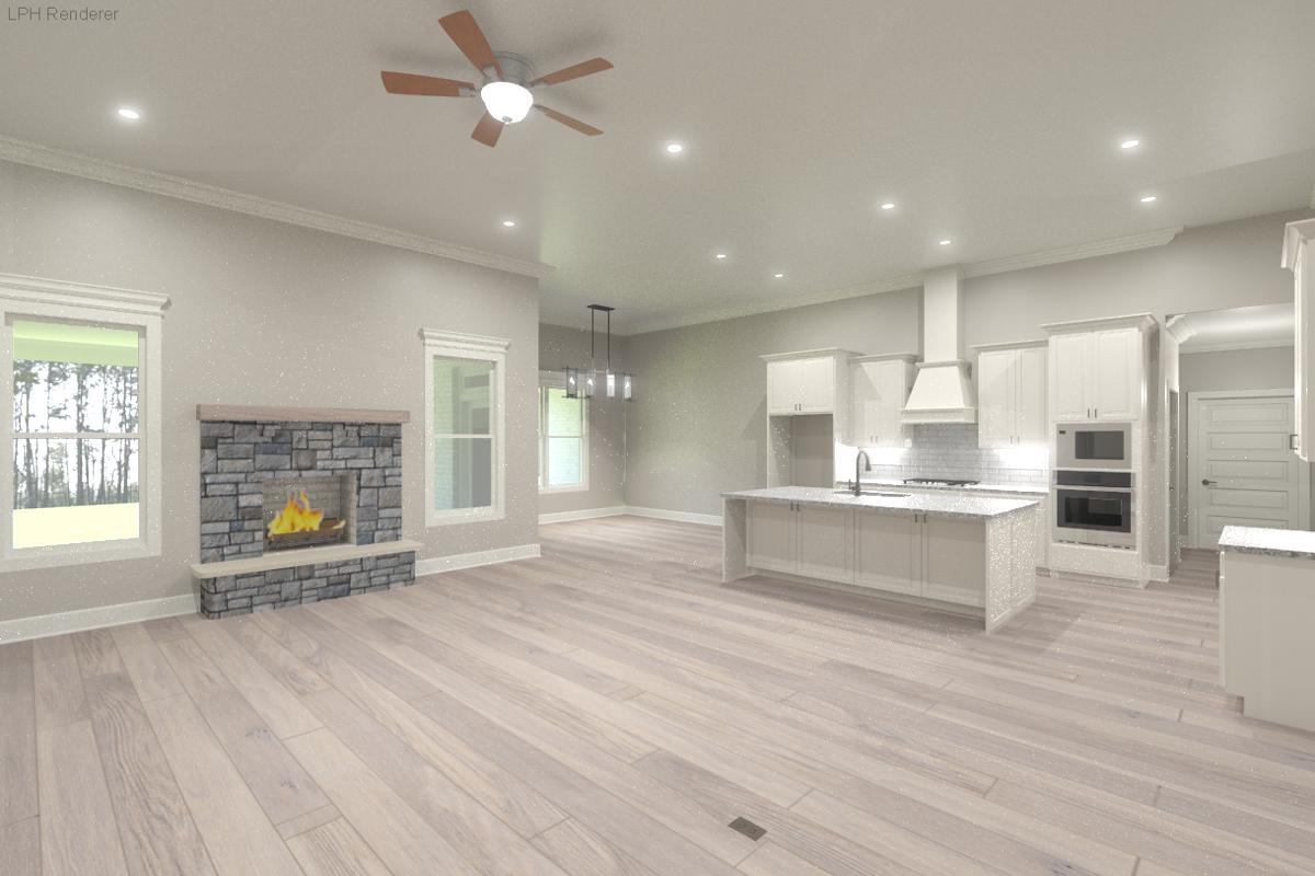 All brick Durham Plan B is an open plan with a 3-car side entry garage backed by a 2-10 home warranty. Home has 4 bedrooms, 3 baths, and huge upstairs bonus room. Home has wood plus flooring (Mohawk Revwood, Engineered Hardwood or similar product) in all living areas and bedrooms. Great Room features 12' ceiling, 8' tall doorways, extensive trim, gas-log fireplace with upgraded fireplace treatment, floor outlet, recessed lights and ceiling fan. Dining room has 12’ coffered ceiling, extensive trim including shadow box under chair rail. Open Kitchen includes 12’ ceiling, 8' tall doorways, 9' soft close custom cabinetry with granite countertops, large island with extra storage and countertop seating, stainless appliances (Gas Cooktop, Cabinet Vent Hood, Wall Oven, Wall Microwave, Dishwasher),...