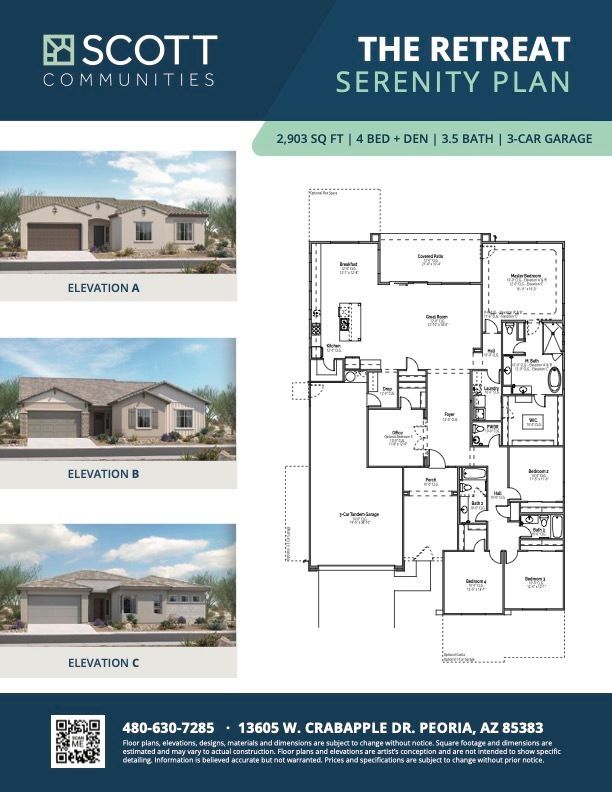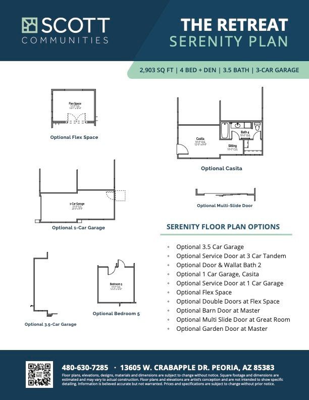 Welcome to a luxurious residence spanning 2,903 square feet. This high-end home features four bedrooms, a den, three baths, and an accessible powder room, ensuring both style and convenience. The included 3-car tandem garage provides ample parking and storage space. The kitchen is a culinary haven, boasting an abundance of cabinetry and countertops, creating a space that is both elegant and practical. The thoughtful design allows for customization, with optional flex space, additional garage parking, a casita for added versatility, or the option to include a fifth bedroom to meet your specific lifestyle needs. Welcome home to a residence that seamlessly combines high-end features with the flexibility to tailor your living space to your desires.