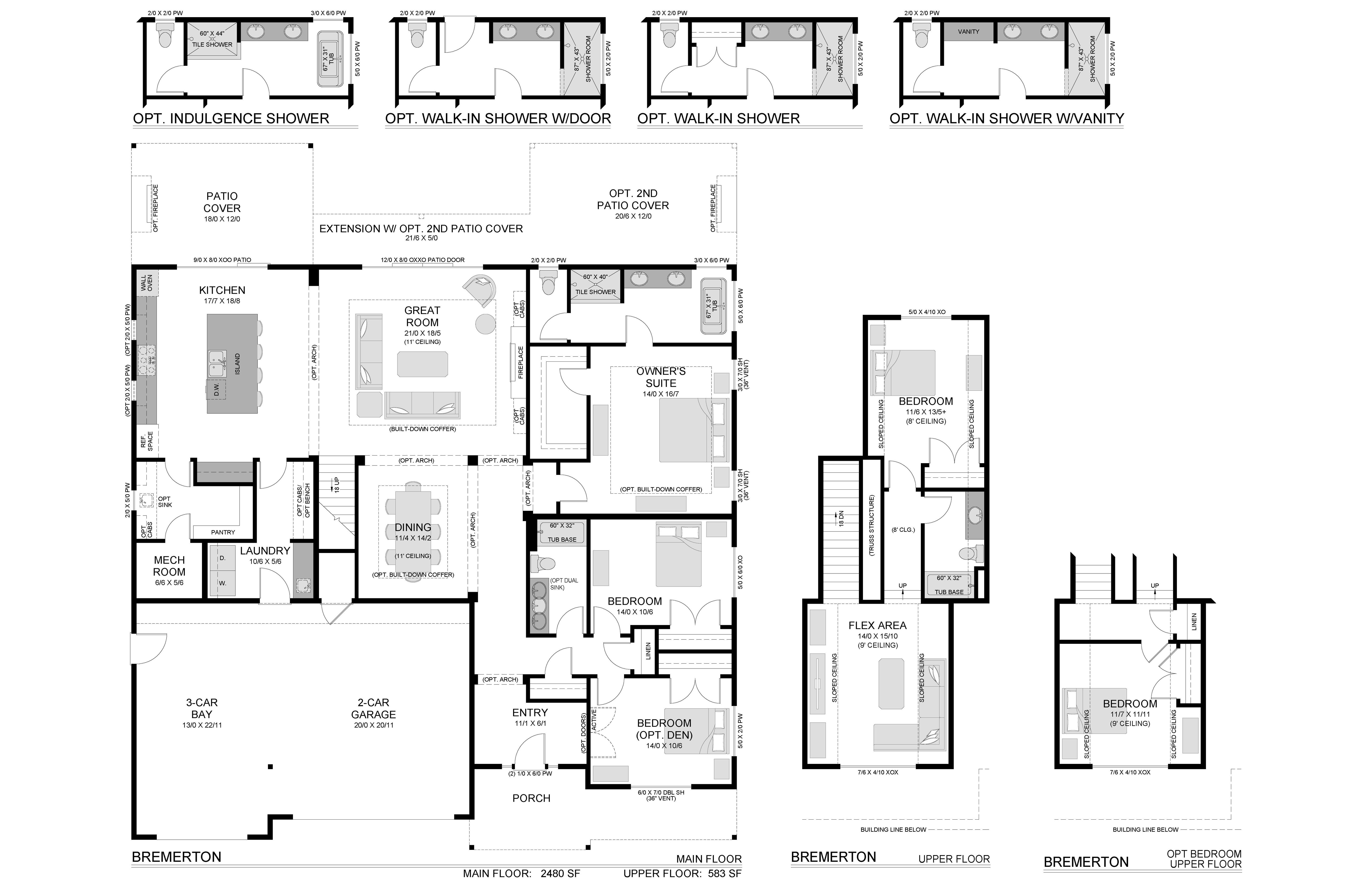 Welcome to The Bremerton. Through the front door, to one side is a den, ideal for a home office or an optional bedroom. Past that is a bedroom, full bath, and the master suite with it’s large walk-in closet, dual sink vanity and large soaking tub. This plan features a great room central to the house, with a formal dining room perfect for entertaining friends and family. On one side of the kitchen, with it’s massive island and opt. wall oven, is the dinette with access to the covered patio, to the other side is the full size laundry room with access to the 3-car garage. From there we go upstairs to the large loft area perfect for movie and game nights. Up a couple more stairs is a full bath and second bedroom.