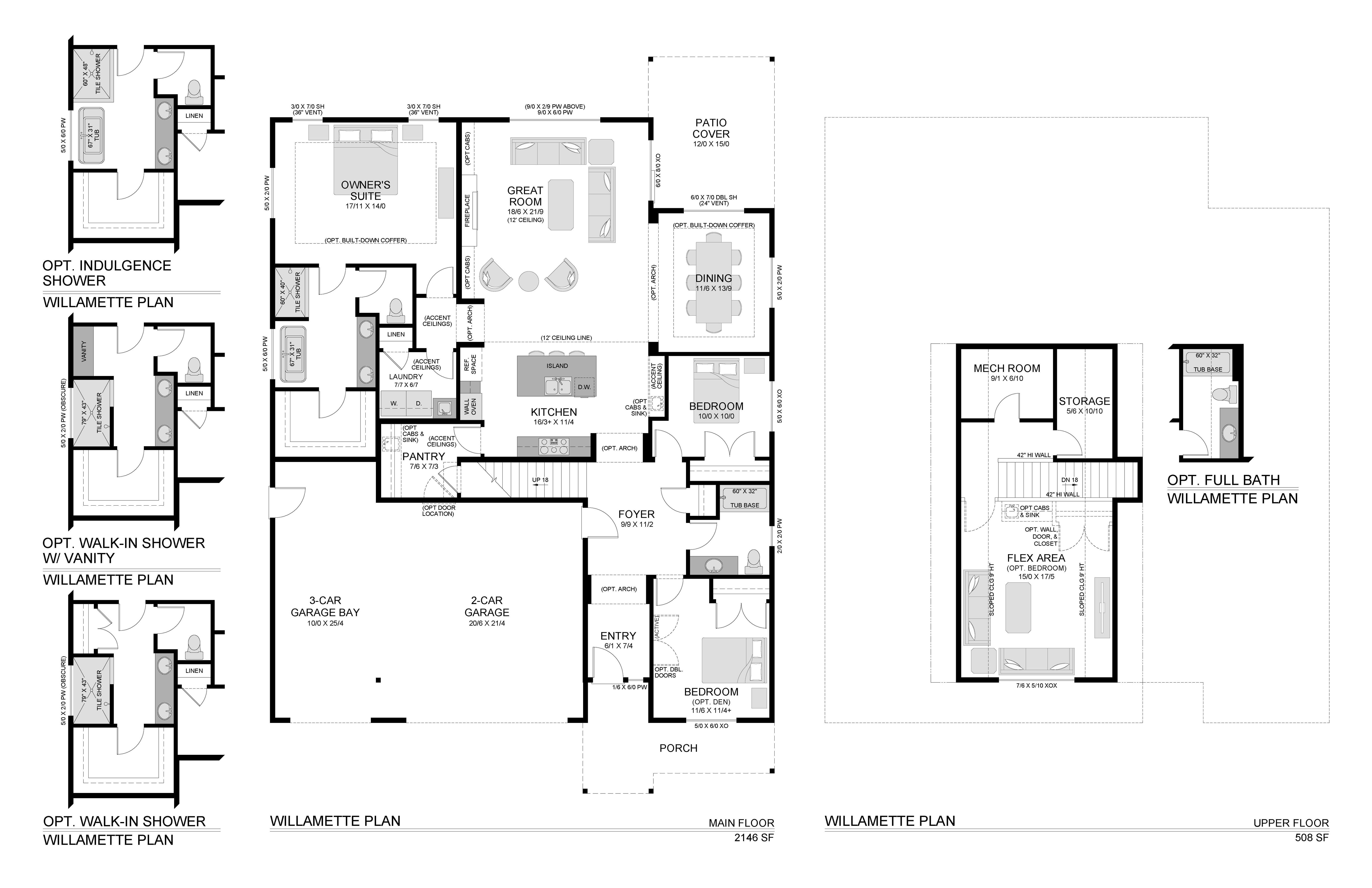 A spacious sibling to the Cashmere, The Willamette offers the same expansive single-level lifestyle— plus a flexible upper floor level for added flexibility. Whether you need a fourth bedroom, home theater, or playroom, this layout adapts beautifully to your needs. This thoughtfully designed plan includes 3 bedrooms (or 2 plus a den with optional double doors), 2 bathrooms, and an included 3-car garage with an extra-deep third bay—perfect for larger vehicles or additional storage. Upstairs, you’ll find a generous flex area, a separate storage closet, and the option to convert the space into a bedroom and even add a third full bath. The heart of the home is the light-filled great room, featuring impressive 11-foot ceilings for an airy, open feel. It flows into a well-equipped kitchen with a...