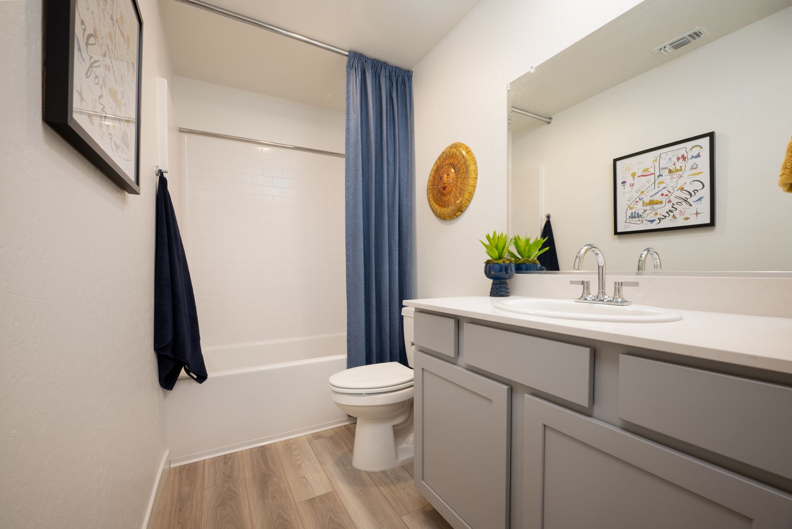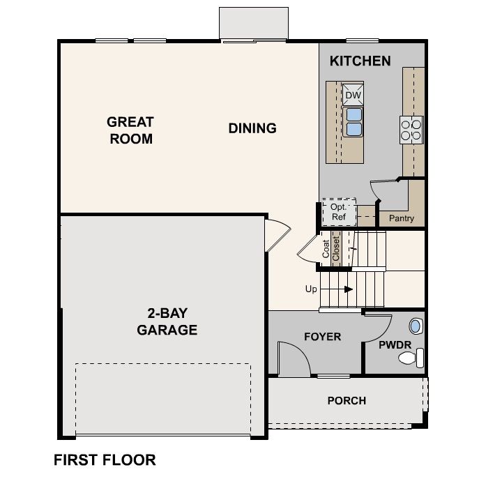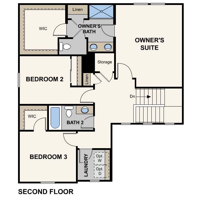 The Jay at Solera III offers a balanced two-story layout. The main level showcases a unified dining and great room, seamlessly blending into a contemporary kitchen featuring a walk-in pantry and central island. Also on the main level, a powder room offers convenience for guests. Upstairs, discover a spacious owner's suite featuring an en-suite bathroom with dual-sink vanity and a walk-in closet. Accompanying this are two secondary bedrooms, which share a full bathroom, and a dedicated full laundry room. This thoughtfully designed plan ensures both comfort and elegance in every corner.