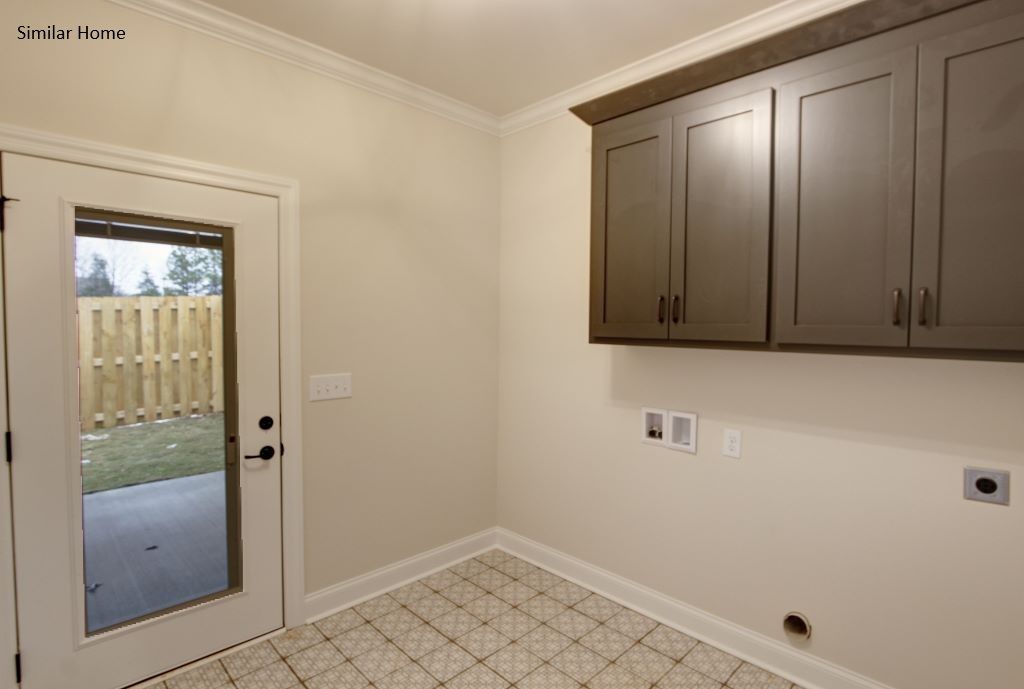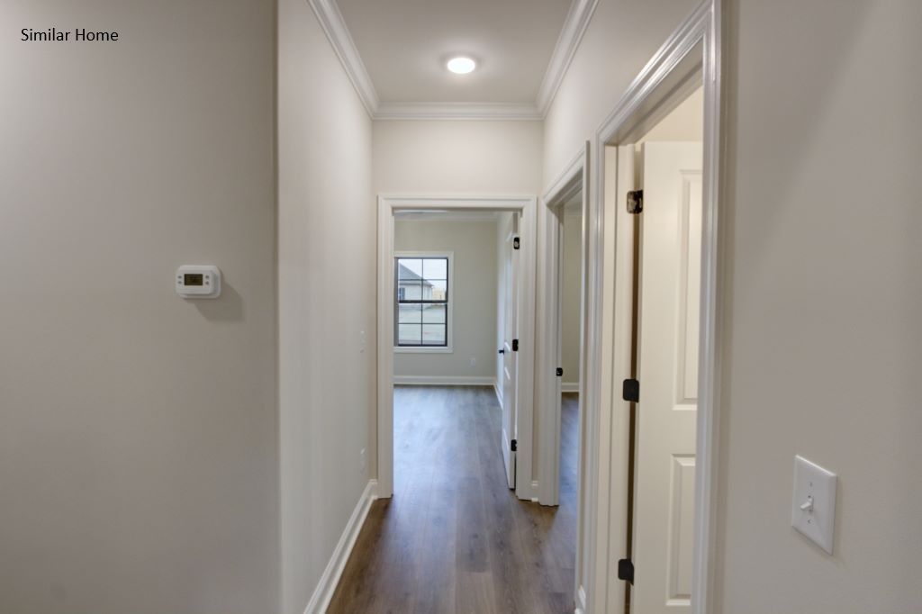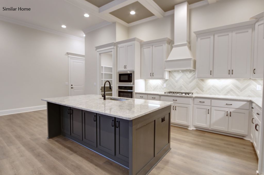 All brick Kilkenny Plan A is an open floor plan with 2 car side entry garage. Home has 3 bedrooms and 2 and 1/2 baths and is backed by a 2-10 home warranty. Home has wood plus flooring (Mohawk Revwood, Engineered Hardwood or similar product) in all living areas and bedrooms. Great Room features 12' ceiling w/ 8' doorways, extensive trim, electric fireplace, recessed lights and ceiling fan. Open Kitchen includes 12’ coffered ceiling, 9' soft close custom cabinetry with granite counter tops, slab island, gas cook top package stainless appliances (Gas Cook Top, Cabinet Vent Hood, Wall Oven and Microwave, Dishwasher), tile backsplash, recessed and under cabinet lighting, and walk-in pantry with wood shelving. Breakfast area features 12' ceiling and crown molding. Master bedroom has a 11' doubl...