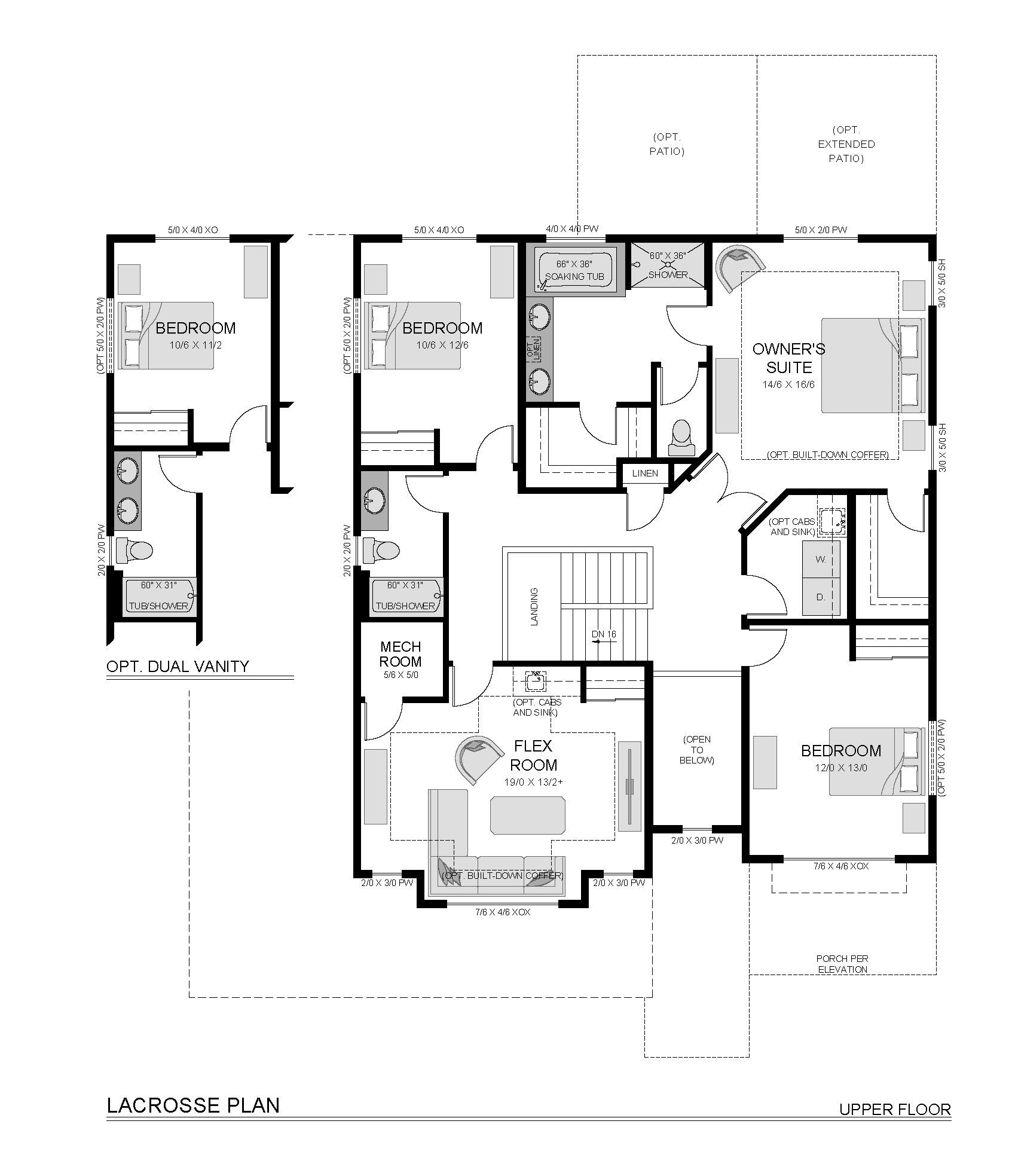 A multiple Parade of Homes award winner, The LaCrosse is one of our most popular plans—blending style, flexibility, and everyday functionality into one stunning home. This spacious layout includes 5 bedrooms, 3.5 baths, including a main-level guest suite with walk-in closet, a den/office, an upstairs flex room / 4th bedroom, and a 3-car garage. The open-concept main level features a large great room that flows seamlessly into the kitchen, complete with an oversized island and adjoining dining area—ideal for hosting family and friends. Upstairs, you’ll find two secondary bedrooms, a full bath with tub/shower combo, a versatile flex room, and a spacious laundry room. The private owner’s suite offers not one, but two generous walk-in closets, along with a luxurious bath featuring dual vanitie...