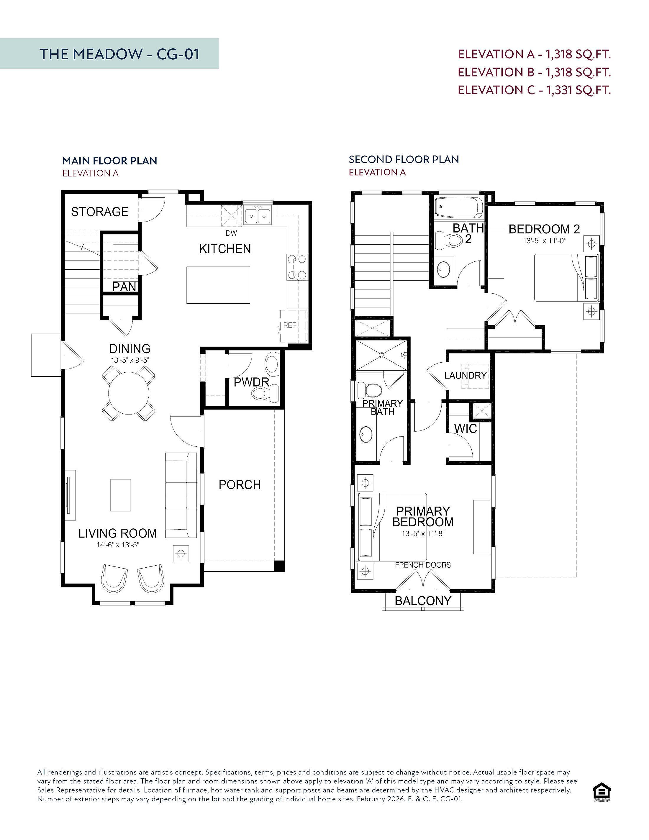 The Meadow plan is a two-story home offering 1,318 square feet of modern, efficient living. The first floor features an open layout with a bright living room, spacious dining area, and a stylish kitchen complete with quartz countertops, 42” upper cabinets, stainless steel appliances, a ceramic tile backsplash, and a large walk-in pantry. A powder bath and bonus storage space add everyday convenience, while the covered front porch creates a warm welcome. Upstairs, the primary suite includes French doors, a private balcony, a walk-in closet, and an en-suite bath with a glass-enclosed shower. A second bedroom with its own full bath, plus a centrally located laundry space, complete the upper level. With luxury vinyl plank flooring in the main living areas, energy-efficient systems, and upgrade...