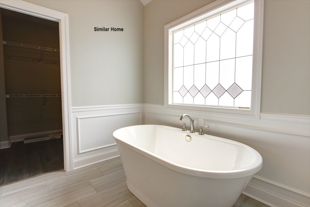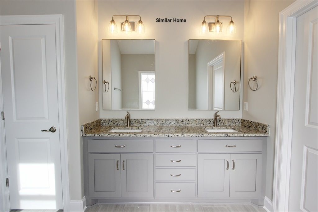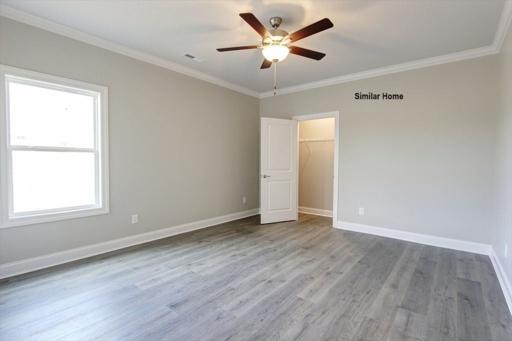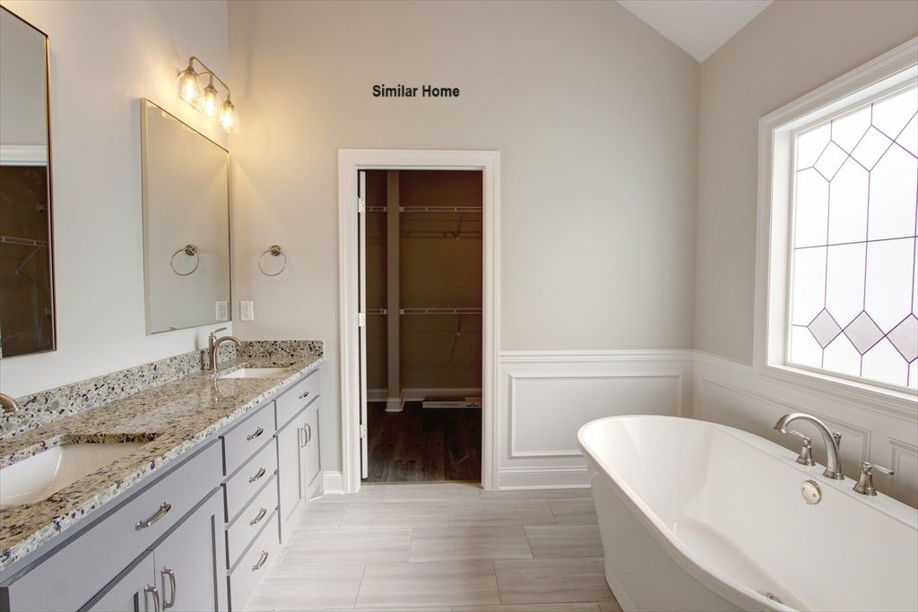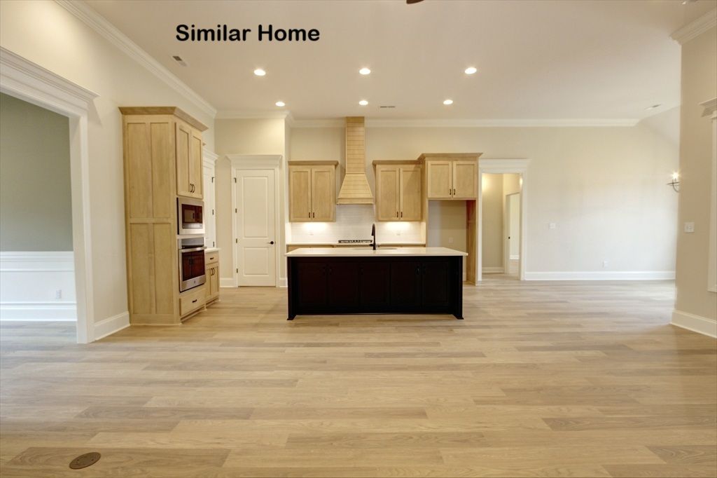All brick Monticello Plan B is an open plan with a 3 car side entry garage backed by a 2-10 home warranty. Home has 4 bedrooms, 3 baths, dining room and a Sunroom. Home has wood plus flooring (Mohawk Revwood, Engineered Hardwood or similar product) in all living areas and bedrooms. Great Room features 12' ceiling with 8' tall doorways, extensive trim, gas-log fireplace with upgraded fireplace treatment, floor outlet, recessed lights and ceiling fan. Dining room has 12’ coffered ceiling with 8' tall doorways and extensive trim including shadow box under chair rail. Sunroom has 12-foot ceiling, 8' French doors from family room and ceiling fan. Open Kitchen includes 12’ ceiling w/ 8' doorways, 9' soft close custom cabinetry with granite countertops, large island with extra storage and counter...