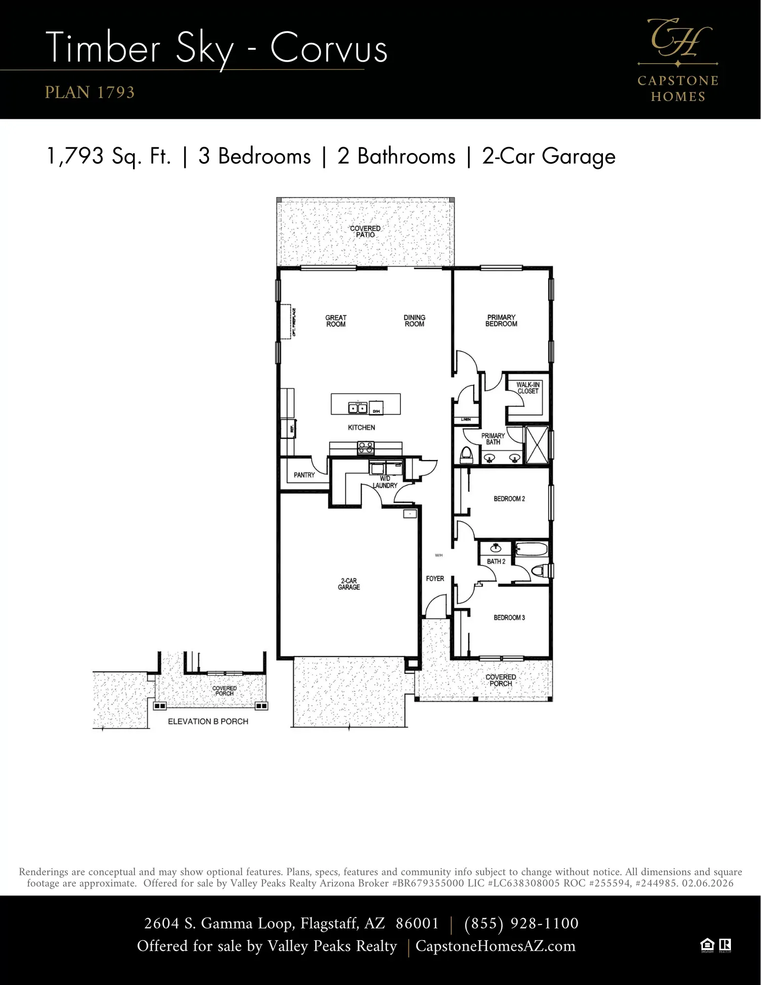 Pre-Model Pricing: Act Now Selling From Timber Sky – Sirius Set against the scenic backdrop of the San Francisco Peaks and nestled along historic Route 66, Timber Sky is Flagstaff’s premier master-planned community where nature and next-generation living come together. Designed with every season and every lifestyle in mind, Timber Sky offers the rare balance of peaceful mountain living and modern convenience. Timber Sky – Corvus offers five plans, both single and two-story homes with square footage ranging in size from 1,793 – 2,488sq ft with a total of 61 home sites. This community is located across from the community amenities area for easy access to the trails, dog park, pickleball, playground and outdoor ramada. More info about Timber Sky - Corvus
