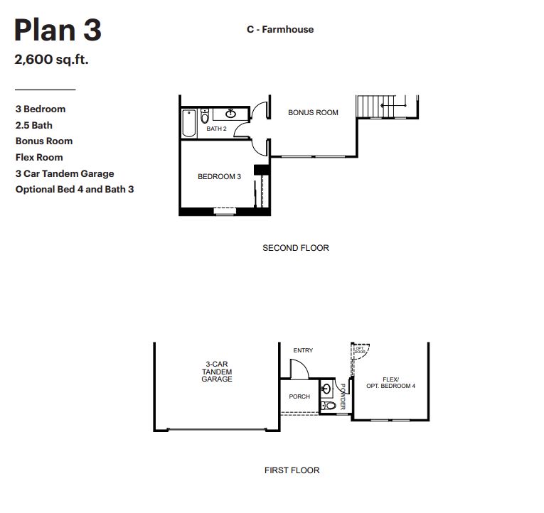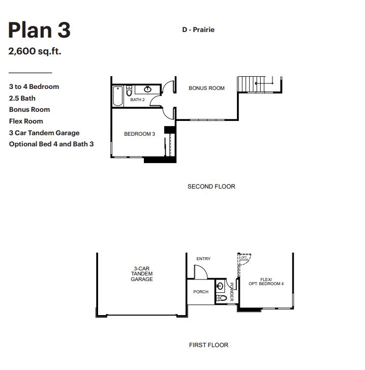 3 Bedroom 2.5 Bath Bonus Room Flex Room 3 Car Tandem Garage Optional Bed 4/ Bath 3 Optional Covered Patio
