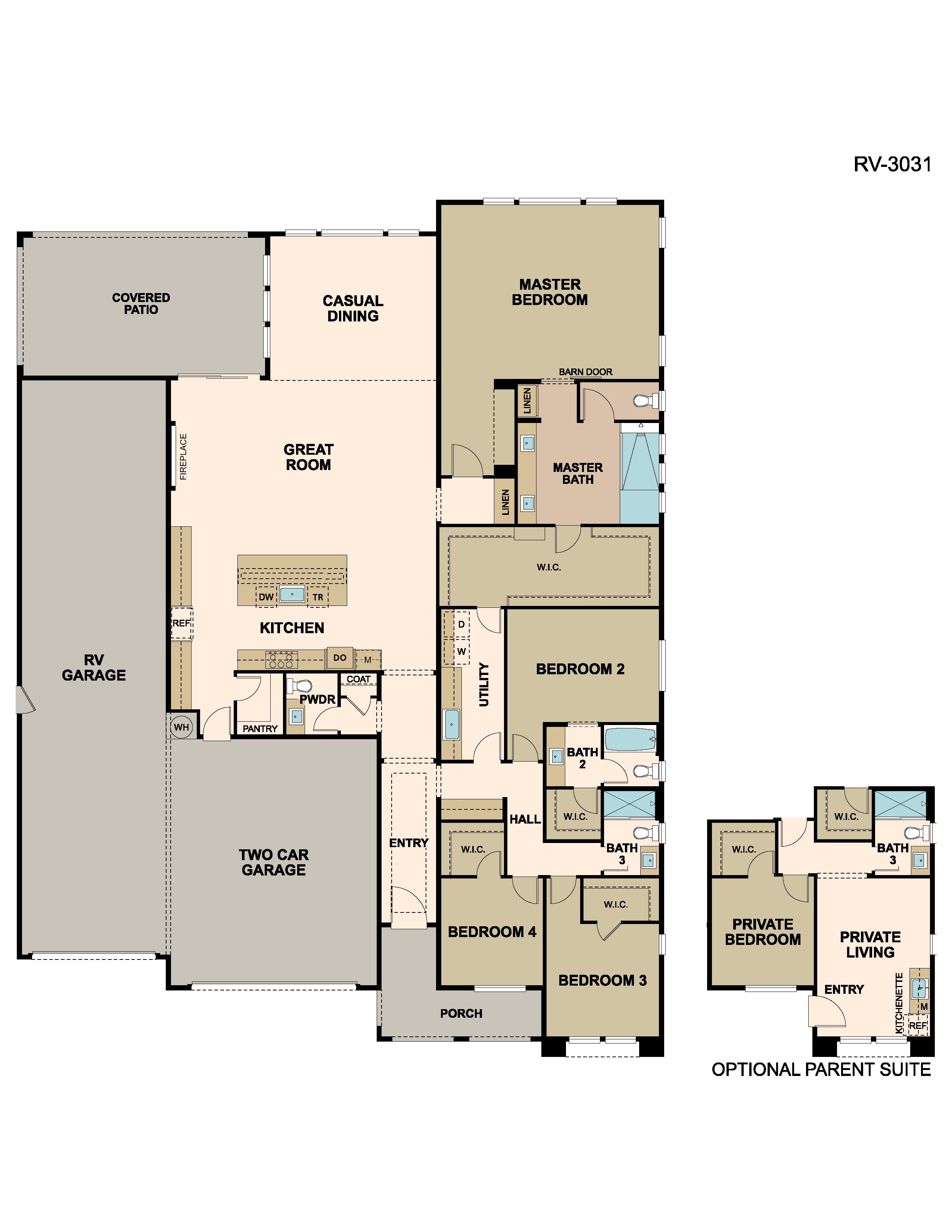 Plan 3031 at Turkey Creek Estates offers 3,031 square feet of single-level luxury with 4 bedrooms, 3 baths, a 2-car garage, and an RV garage. The open-concept kitchen, great room, and dining area create an inviting space for gathering, while the covered patio encourages seamless indoor-outdoor living. The optional parent suite adds flexibility with a private living area, kitchenette, and full bath, perfect for multi-generational living. The primary suite at the back of the home features a spa-inspired bath and a large walk-in closet that's positioned conveniently next to the laundry. Thoughtfully designed for comfort, convenience, and adventure, Plan 3031 elevates modern living in Lincoln.