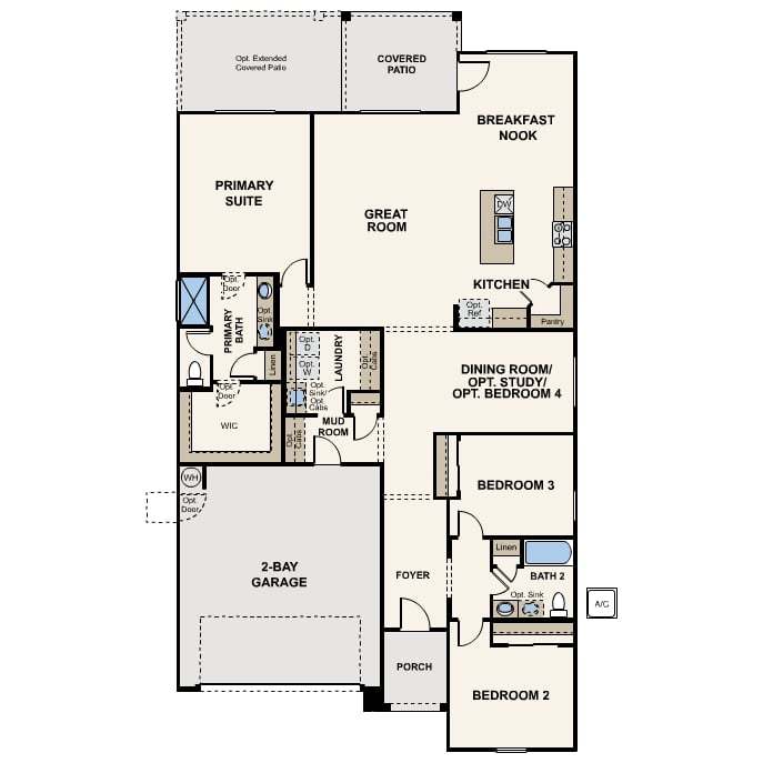 Ranch | 2 Bay Garage with Entry | Mud Room | Foyer | Laundry Room | Open Kitchen with Island, Pantry and Breakfast Nook | Dining Room | Great Room with Yard Access | Primary Suite with Bath and Large Walk-In Closet | Secondary Bedrooms with Shared Full Bath | Covered Patio Options: Study in Lieu of Dining Room, Bedroom 4 in Lieu of Dining Room, Primary Bath Tub and Shower, Primary Bath Shower. Impressive Included Features: 9’ ceilings throughout, covered patio, front yard landscaping, ceramic tile flooring at entry, kitchen, all baths and laundry, granite slab counters in kitchen and baths, stainless steel kitchen appliances, Century Home Connect smart home technology.