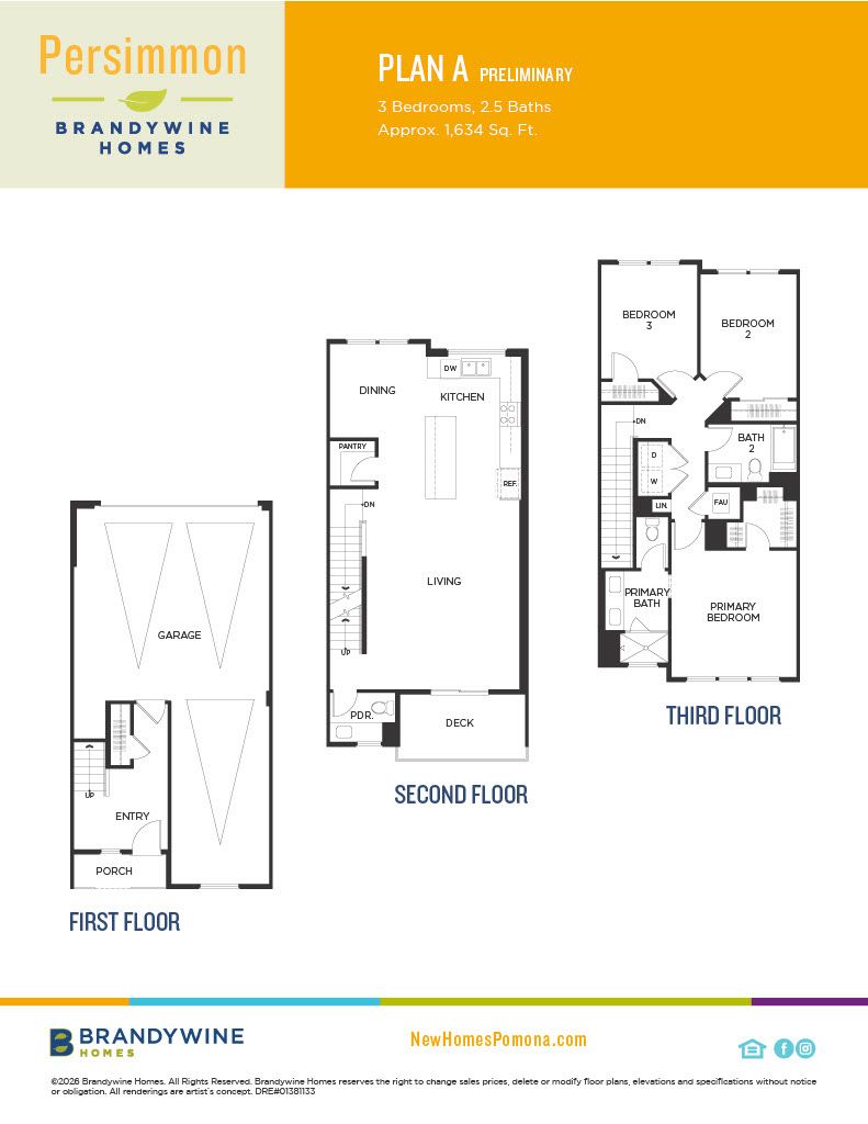 3 Bedrooms, 2.5 Baths Approx. 1,634 Sq. Ft. Sleek and welcoming, this floor plan has it all for those seeking the best of new construction. Enjoy an open plan design and a gourmet kitchen with an island. The second-floor deck adds even more indoor/outdoor versatility. With three bedrooms, there’s plenty of room to thrive. Make the move to Persimmon now!