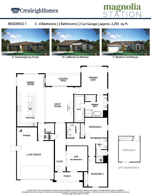 Residence One is the smallest of the floor plans offered at Magnolia Station but at 2,293 square feet, there is plenty of space in this single story home. With three bedrooms, two bathrooms, den, great room, and dining room, there is enough room for all members of the family to have their corner of the house. The two car garage boasts ample storage and a covered patio comes included in the home. The den can easily be transformed into a fourth bedroom if needed. Enjoy the luxuries included in a Cresleigh Home such as hand set tiles in entry way, kitchen and wet areas, large eat-in kitchen island, ample storage, and All-Ready Smart Home package.