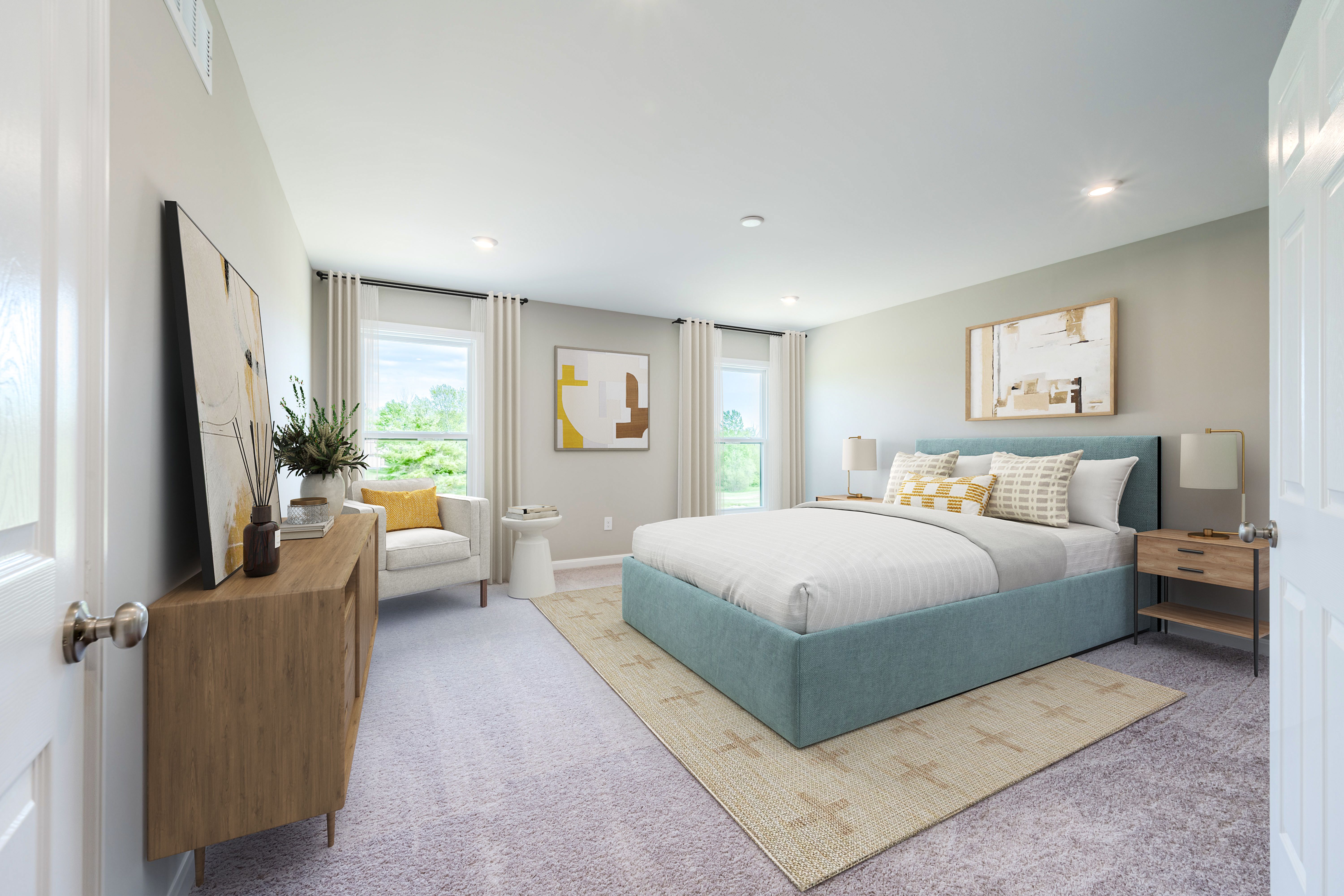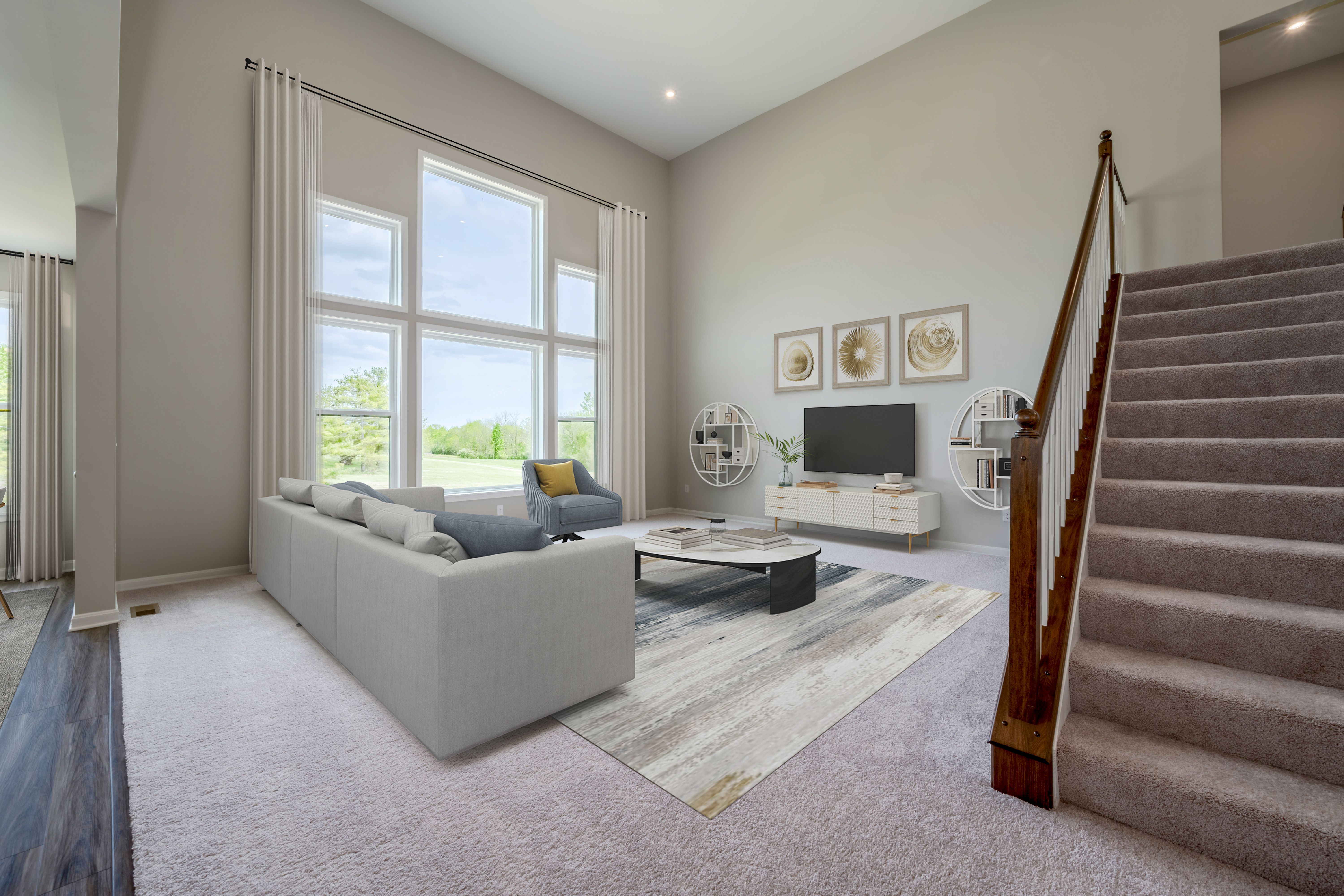 The Rhodes by Fischer Homes offers an innovative five-level design, perfect for modern living. Featuring 9-foot ceilings on the first floor and a soaring 103 ceiling in the rec room, this plan boasts the largest two-story family room and rec room in its collection. The primary suite is situated on its own private level and includes an extra-large walk-in closet for added luxury. Customize your home with options like a three-car integrated front garage, a shared bath, or a full bath for Bedroom 2. The Rhodes provides a spacious and adaptable layout to suit your lifestyle.