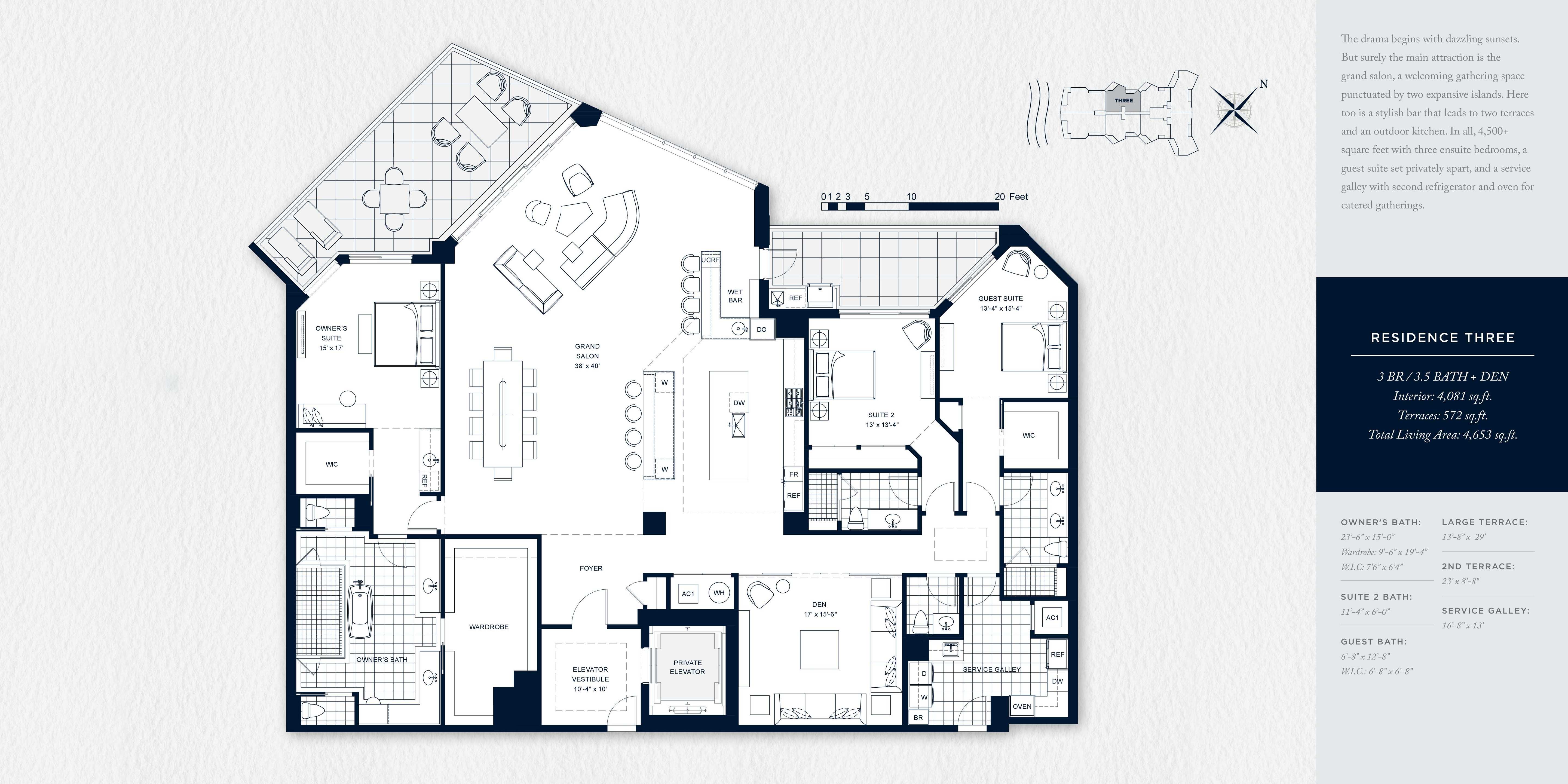 RESIDENCE THREE 3 BR / 3.5 BATH + DEN Interior: 4,081 sq.ft. Terraces: 572 sq.ft. Total Living Area: 4,653 sq.ft. The drama begins with dazzling sunsets. But surely the main attraction is the grand salon, a welcoming gathering space punctuated by two expansive islands. Here too is a stylish bar that leads to two terraces and an outdoor kitchen. In all, 4,500+ square feet with three ensuite bedrooms, a guest suite set privately apart, and a service galley with second refrigerator and oven for catered gatherings.