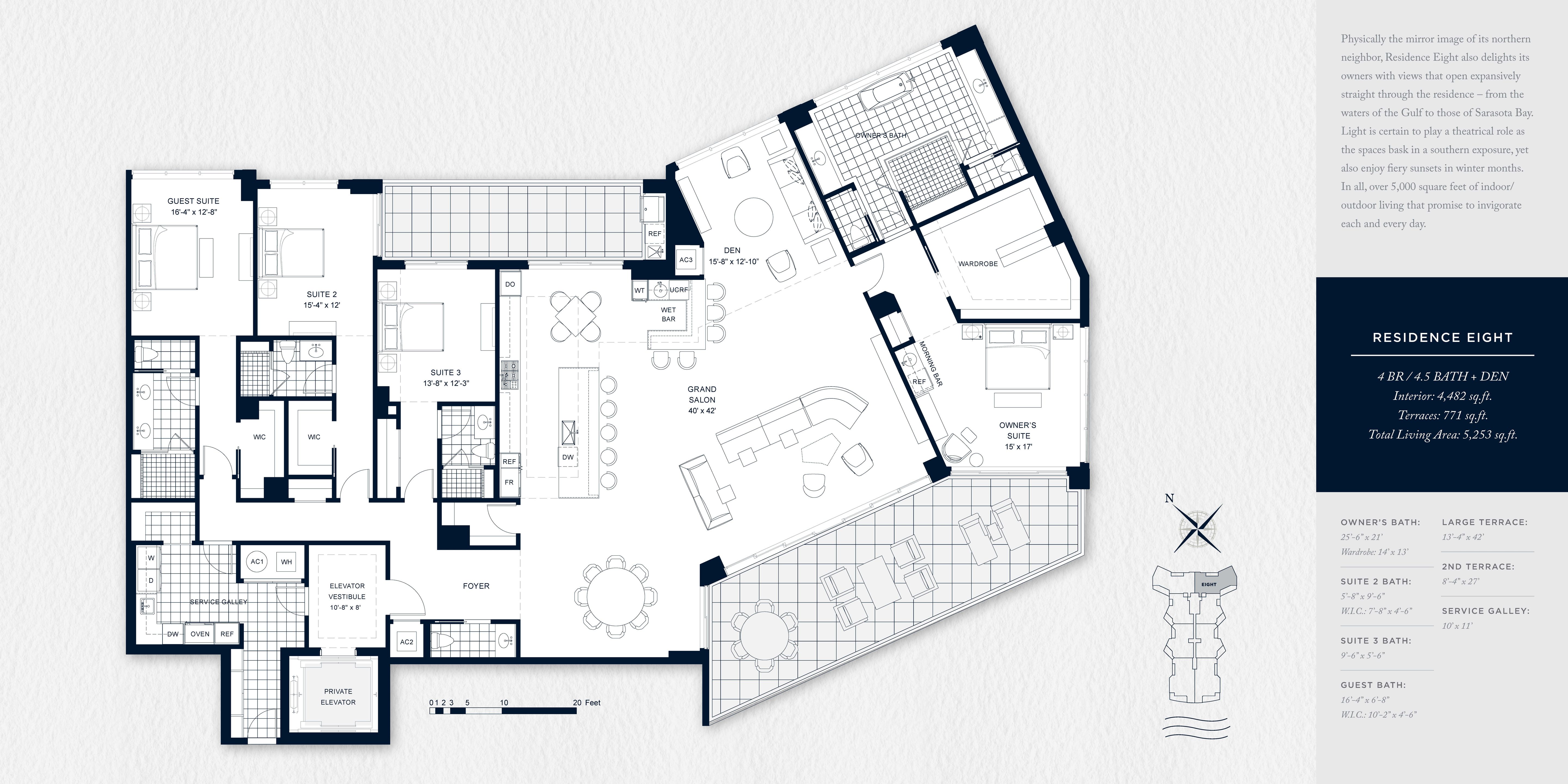 RESIDENCE EIGHT 4 BR / 4.5 BATH + DEN Interior: 4,482 sq.ft. Terraces: 771 sq.ft. Total Living Area: 5,253 sq.ft. Physically the mirror image of its northern neighbor, Residence Eight also delights its owners with views that open expansively straight through the residence – from the waters of the Gulf to those of Sarasota Bay. Light is certain to play a theatrical role as the spaces bask in a southern exposure, yet also enjoy fiery sunsets in winter months. In all, over 5,000 square feet of indoor/outdoor living that promise to invigorate each and every day.