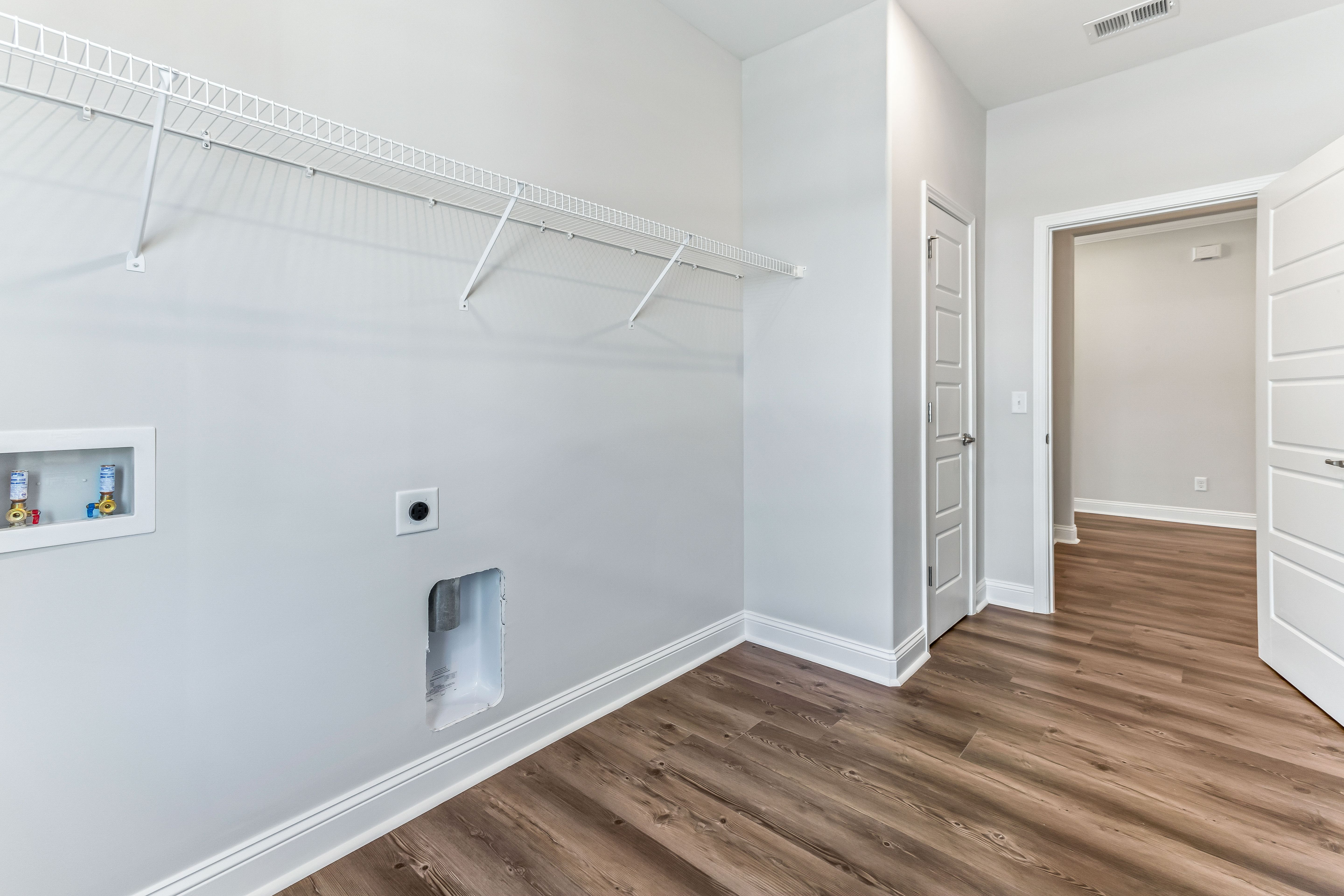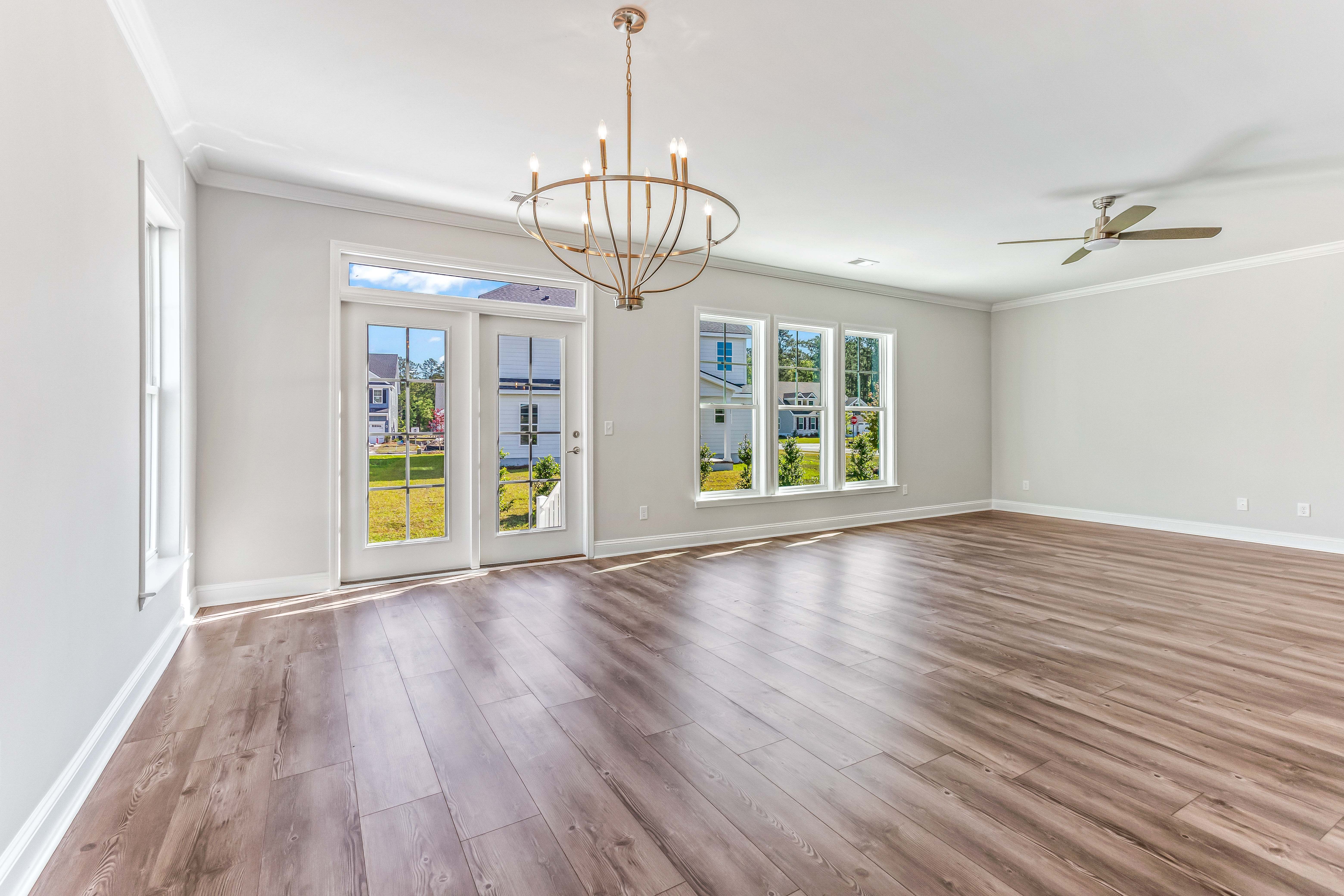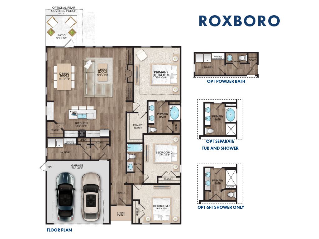 This open single-story floor plan features a large great room and spacious primary suite. This home also has a private laundry room with an optional half bath conveniently located just off of the garage. An additional option includes a rear covered porch.