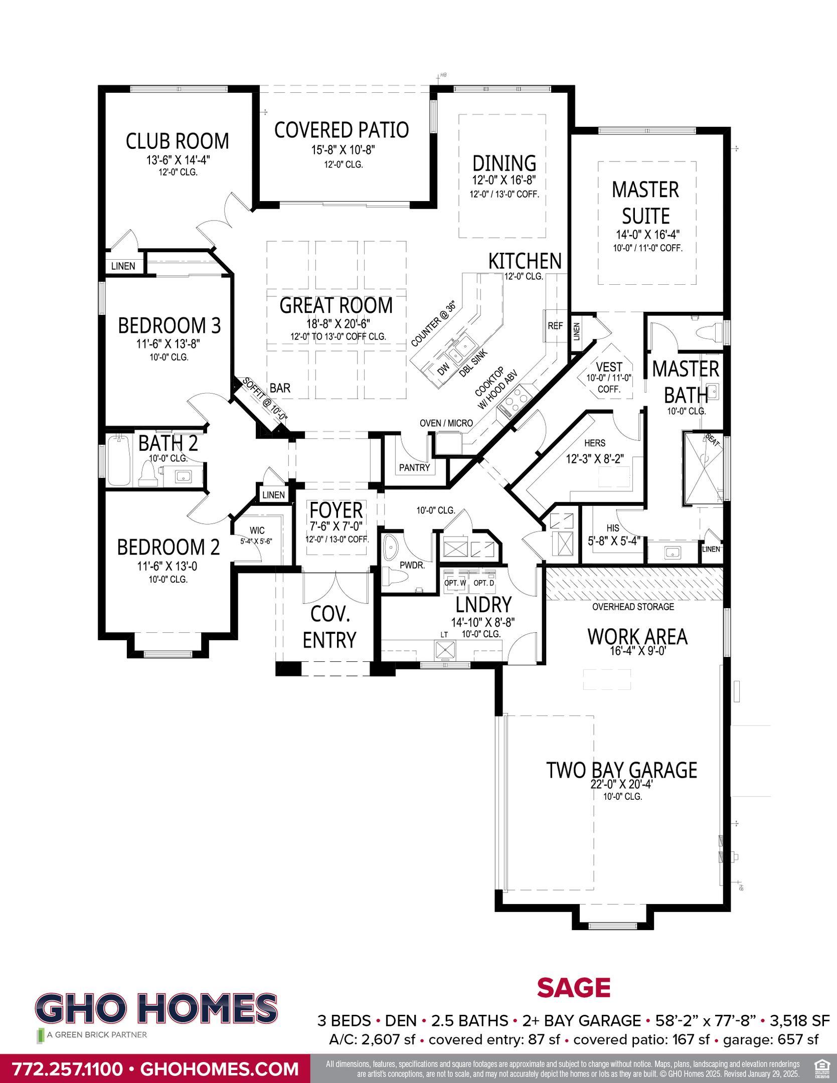 The Sage floor plan offers 3 bedrooms, 2.5 bath, den and 2 car garage with workshop area. The home features an open-concept layout while offering privacy with the bedrooms located off private hallways. The great room located at the center of the home offers high coffered ceilings, an expansive slider opening the home to lots of natural light and creating seamless flow from indoors to the lanai. The kitchen is perfect for entertainment with a large counter height island, quartz countertops, high-end appliances and expansive walk-in closet. The dining area with large windows and coffered ceiling enhances the welcoming and elegant feel of the home. Adjacent to these areas is a club room and outside the sliders a lanai overlooking a custom pool.The master suite is perfectly private, with a ves...