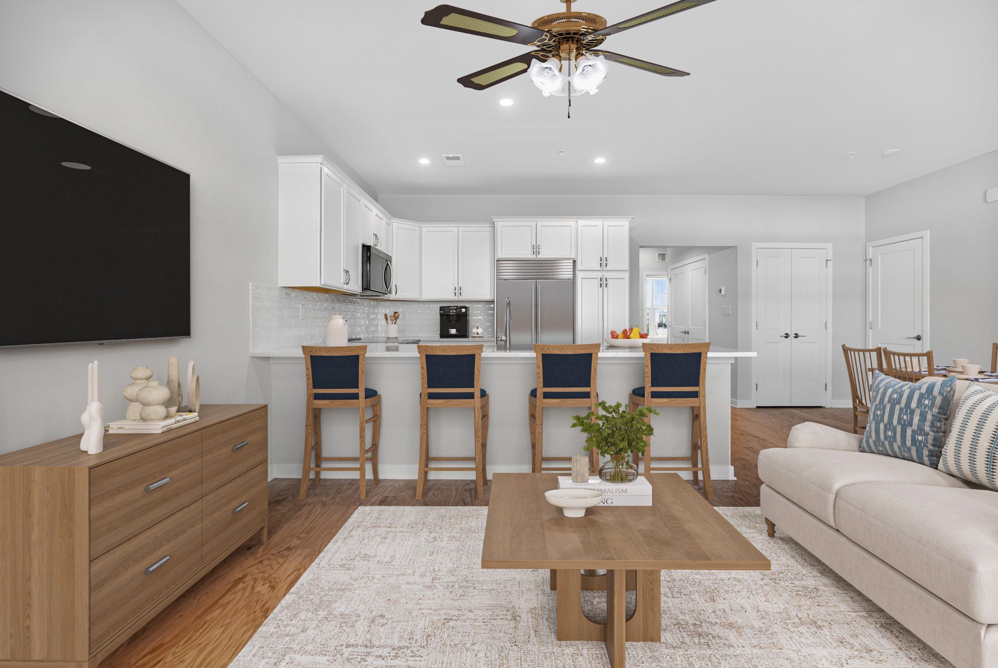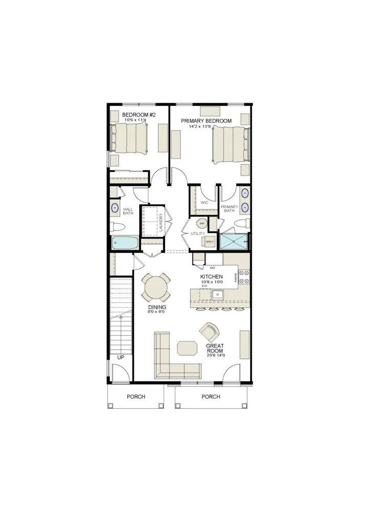 Welcome to first-floor living at its finest. The Abbot has an open floor plan complete with a great room, dining area, and kitchen. There’s plenty of open space for entertaining. The spacious primary bedroom suite has a large walk-in closet and a luxurious bathroom with a double vanity and a walk-in shower. The second bedroom and full hall bath are perfect for guests. Laundry is conveniently located steps away from the bedrooms.