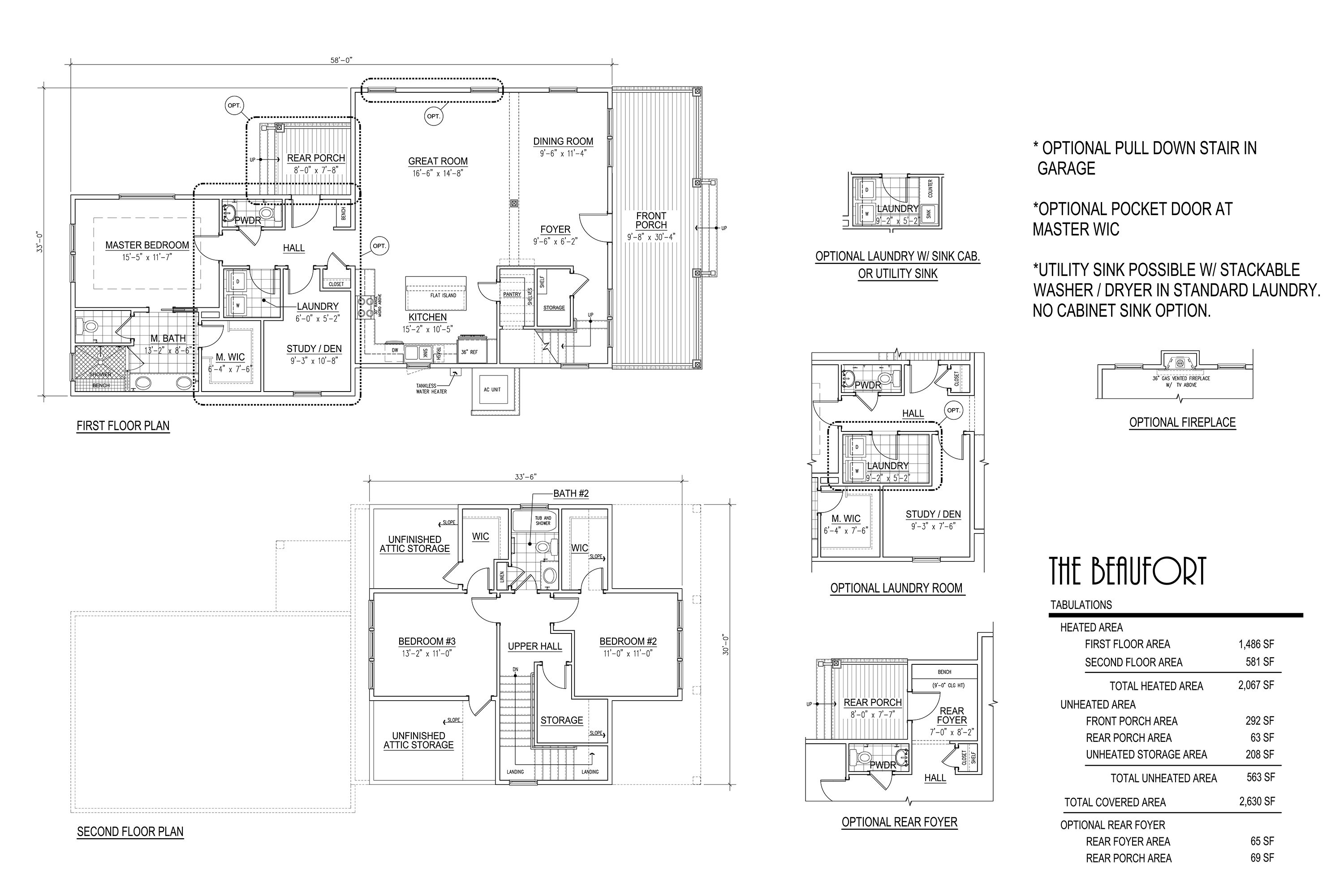 At 2,067 heated sqft, the two story Beaufort home offers 3 bedrooms with a first level master suite and study and 2.5 bathrooms. Just a few of the optional interior upgrades include a fireplace in great room, larger laundry room, and rear foyer.