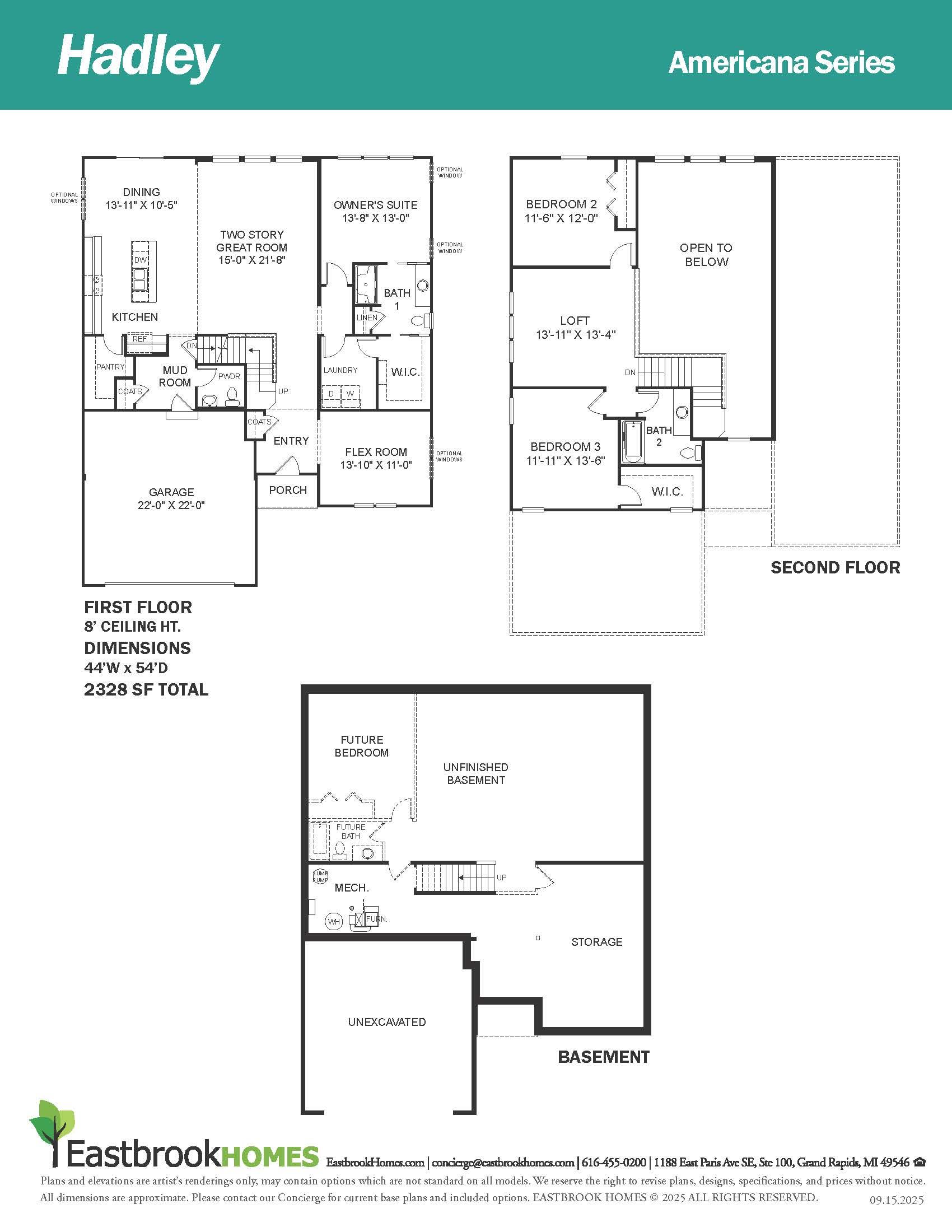 Buildable Home Plan - Photos are Representational Stately and contemporary, the Hadley home plan is a two-story design offering 2328 square feet of living space, four bedrooms, and two and a half baths. Enter your Hadley home plan and see a conveniently located flex room, perfect for an at-home office, playroom, or hobby room. Continue down the hall into your two-story great room, dining room and kitchen. Your great room is truly awe-inspiring, with the option to add a gorgeous Michigan four-seasons room. Your kitchen faces into the dining room, allowing for a perfect open concept entertainment space. From your kitchen, you can walk into your mudroom and powder room, which is conveniently located by the garage entrance. This is the perfect spot to keep your seasonal wear tidy and organized...