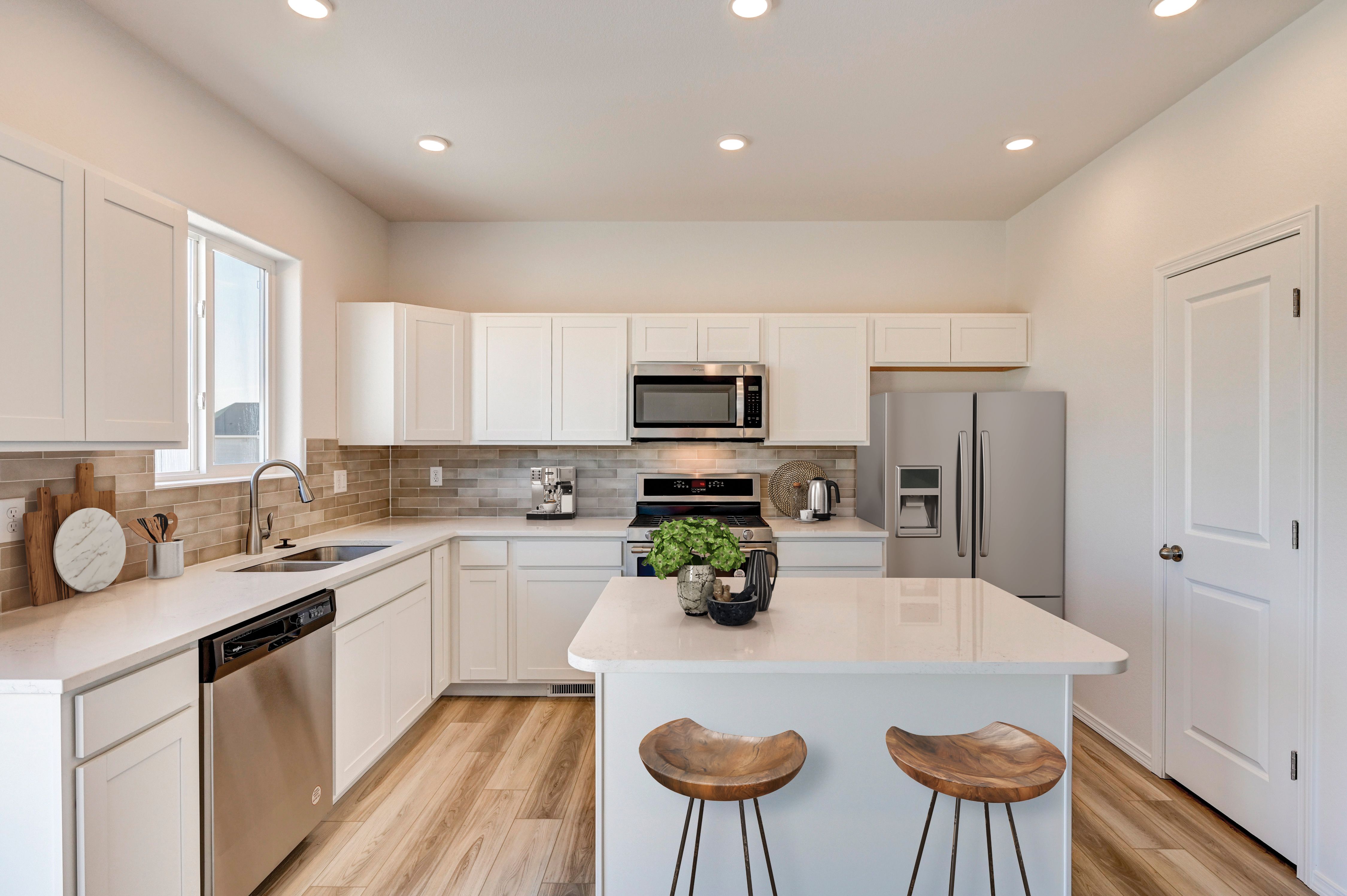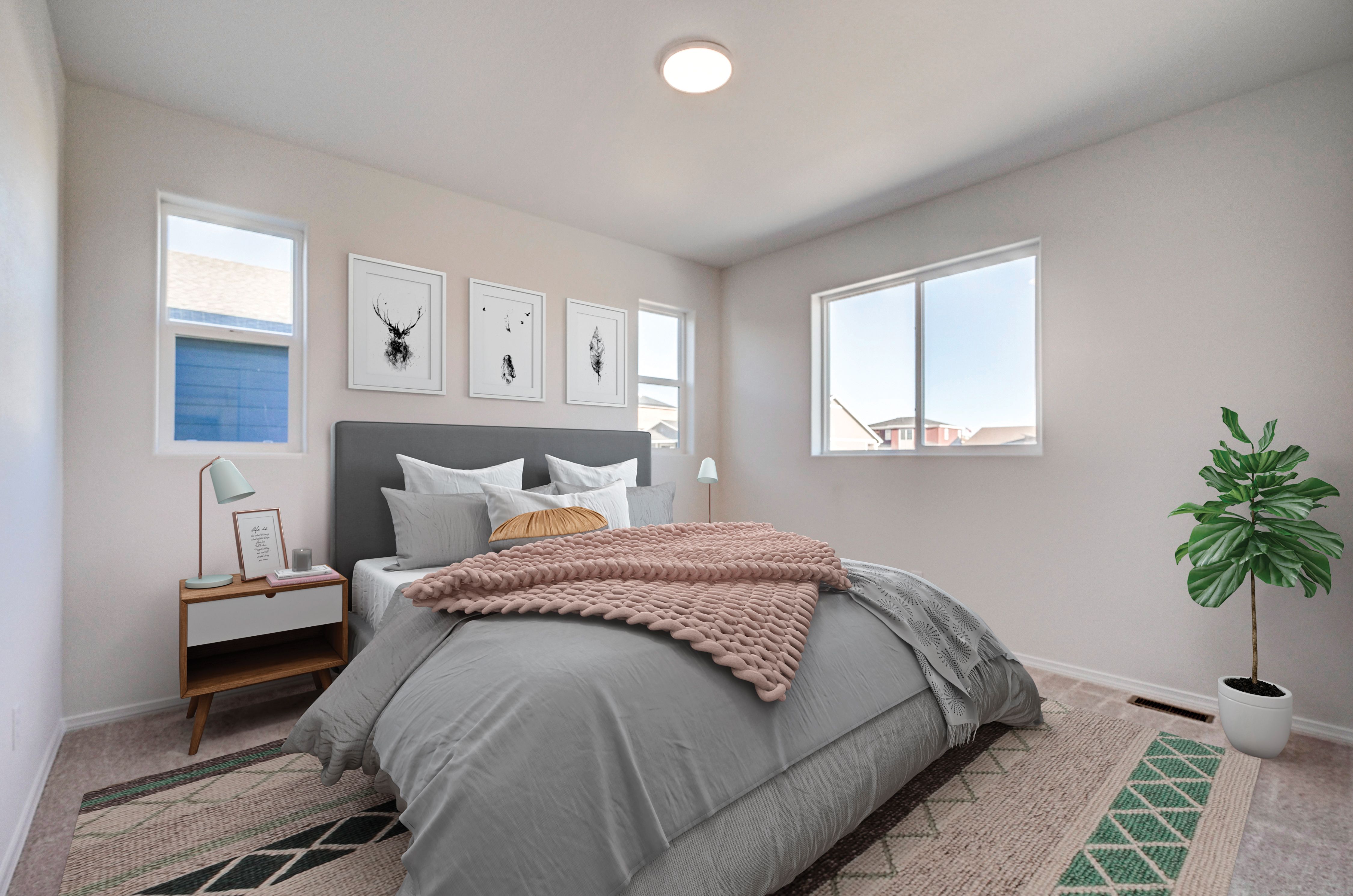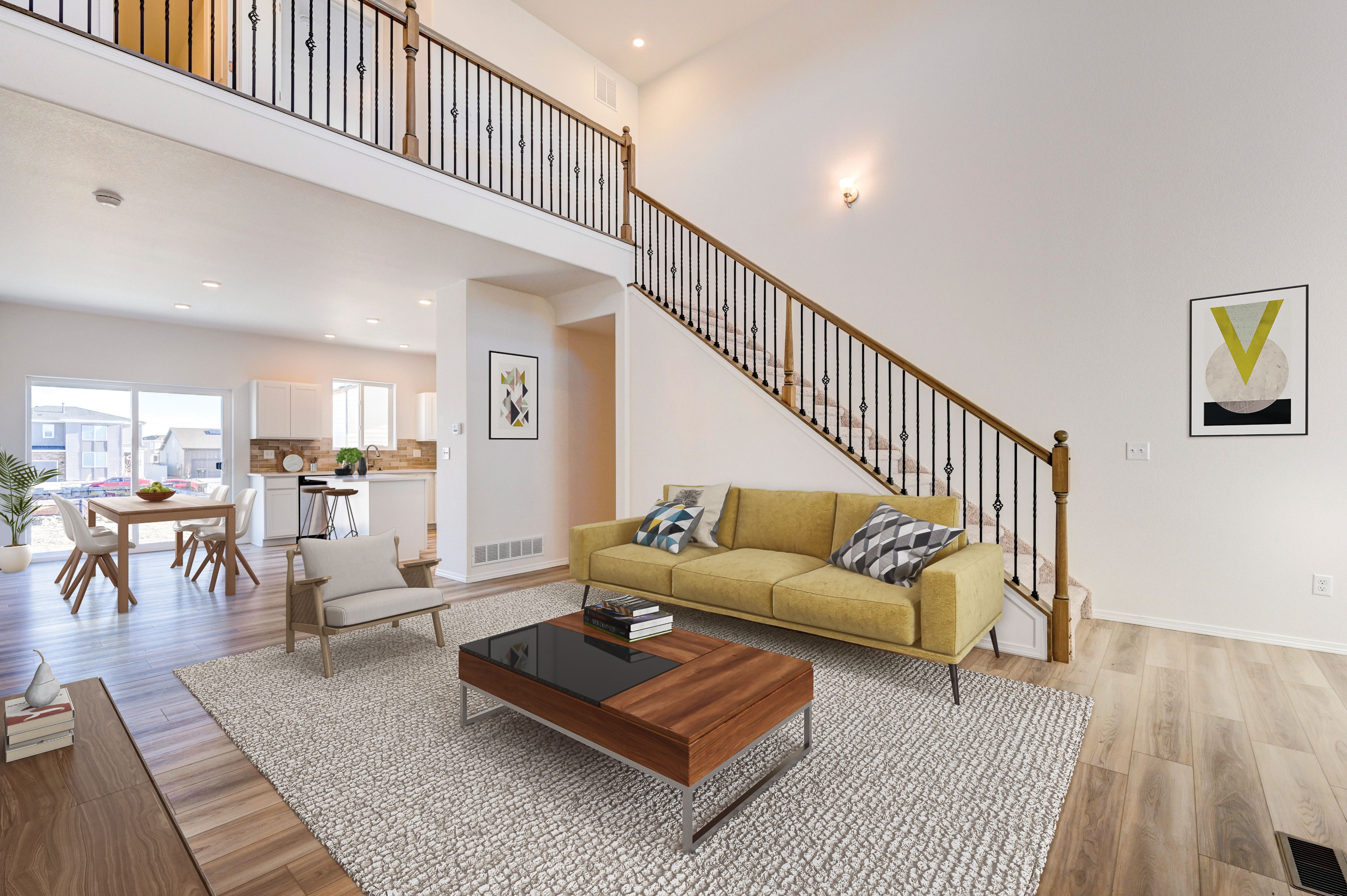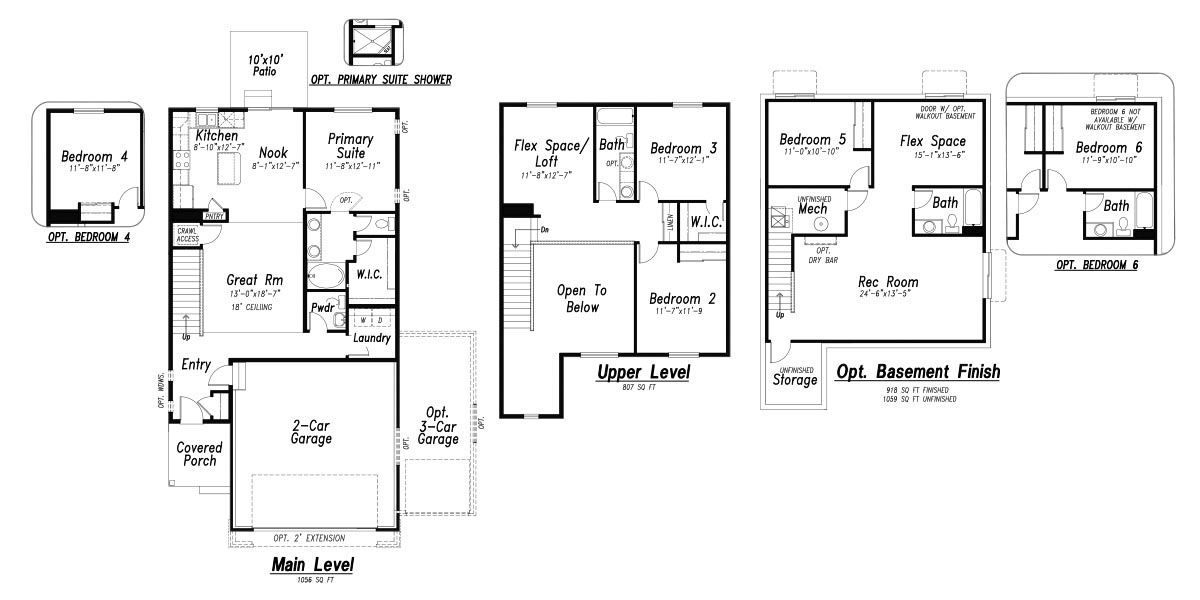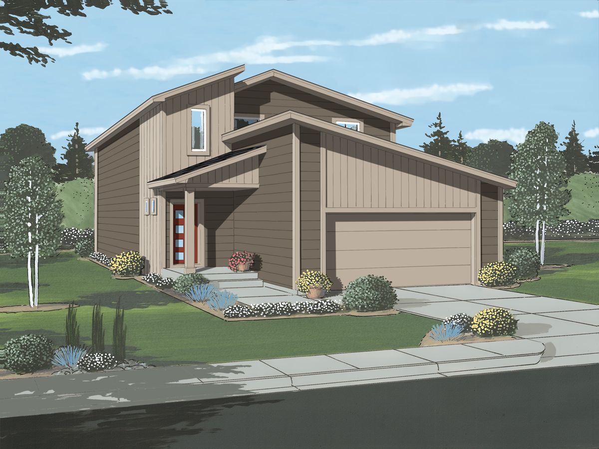 This stylish, mid-century modern home offers an open plan with an 18' ceiling in the great room, a kitchen with island, eating nook, and pantry. The primary bedroom suite with spacious walk-in closet, is on the main level, as well as the laundry room and half bath. There is a 10x10 patio to enjoy BBQs just off the dining nook. On the upper level are two more bedrooms and a bath and a loft/flex space. An optional bedroom can replace the loft. Other options include a 3rd car garage and the optional basement finish adds 1-2 more bedrooms, a rec room and an additional bathroom. Square footage on this plan ranges from 1,863 to 2,922, with 3-6 bedrooms and 2.5-3.5 bathrooms. Starting under $500k, this home offers quality construction and desirable finishes at an exciting price!