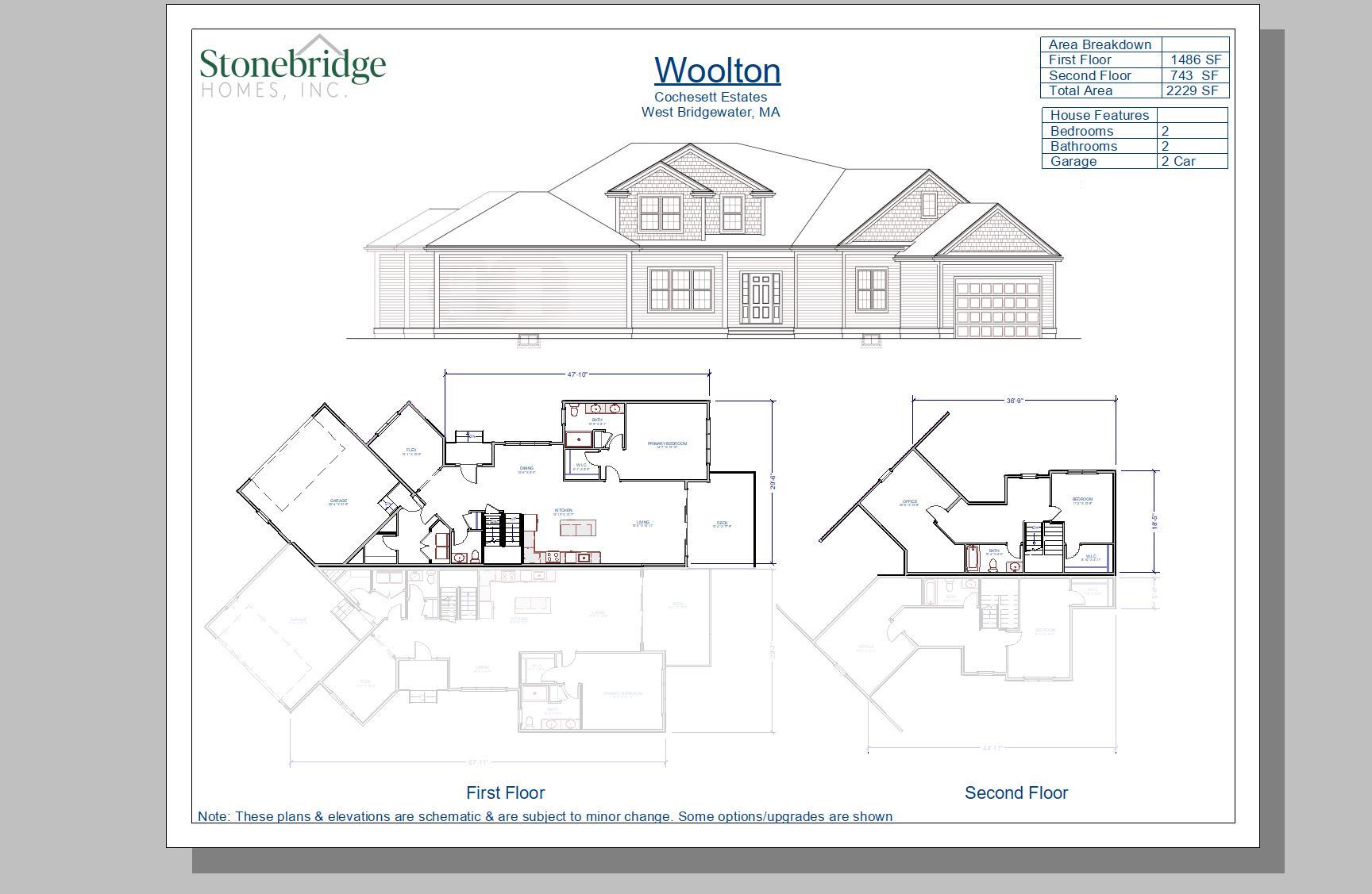 The Woolton duplex unit offers a warm and functional layout with 2 bedrooms, 2 bathrooms, and a total of 2,229 square feet of living space. The first floor encompasses 1,486 square feet and features an open-concept living area, including a spacious kitchen, dining space, and a comfortable living room ideal for gatherings or quiet evenings. The primary bedroom suite is conveniently located on the main level with an en suite bath and generous closet space. A second bedroom and full bathroom complete the main floor.The second floor, with 743 square feet, provides flexible space perfect for a home office, guest area, or additional lounge. A 2-car garage adds everyday convenience and storage capacity.Located in Cochesett Estates in West Bridgewater, MA, the Woolton balances modern amenities wit...