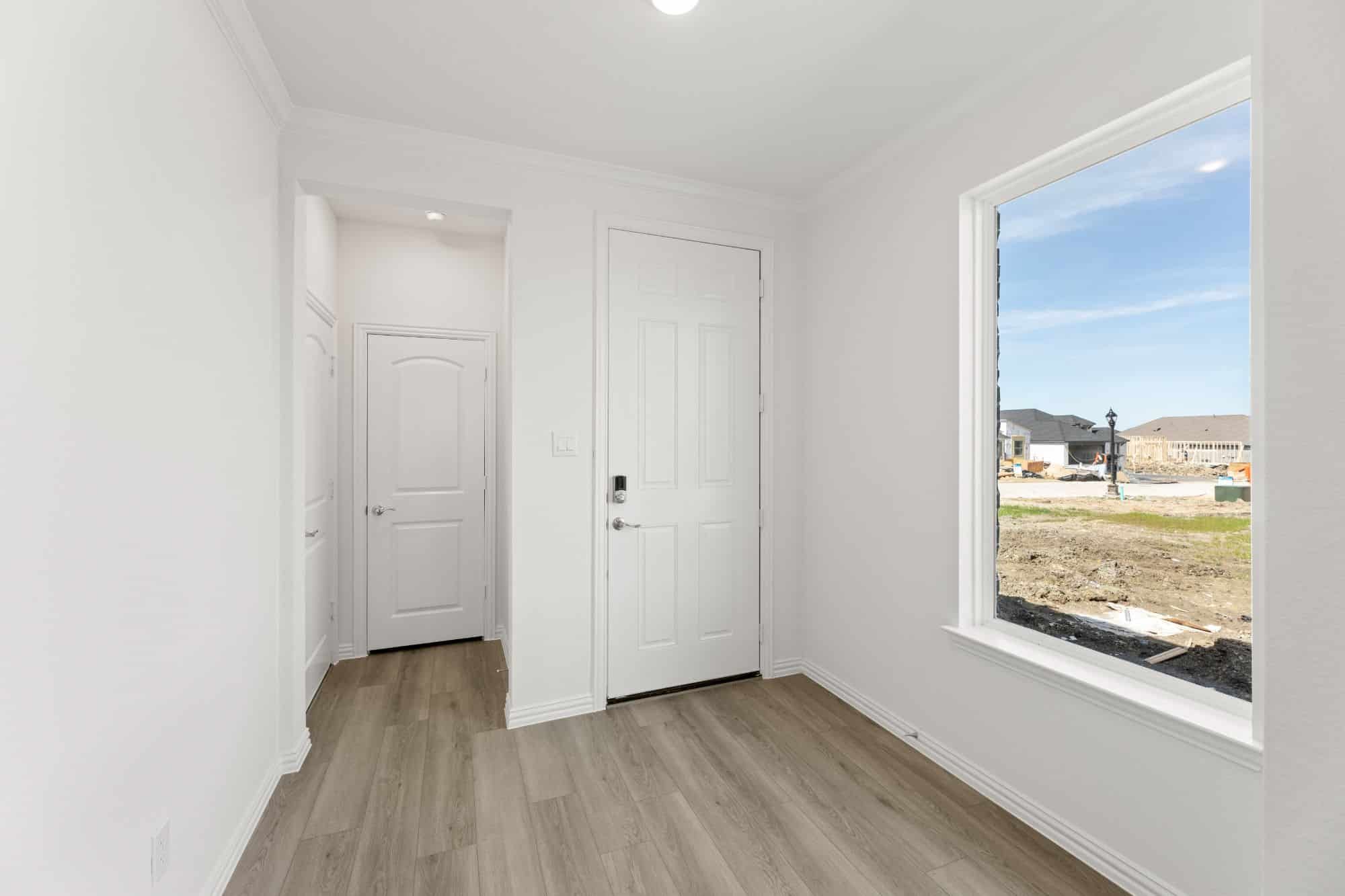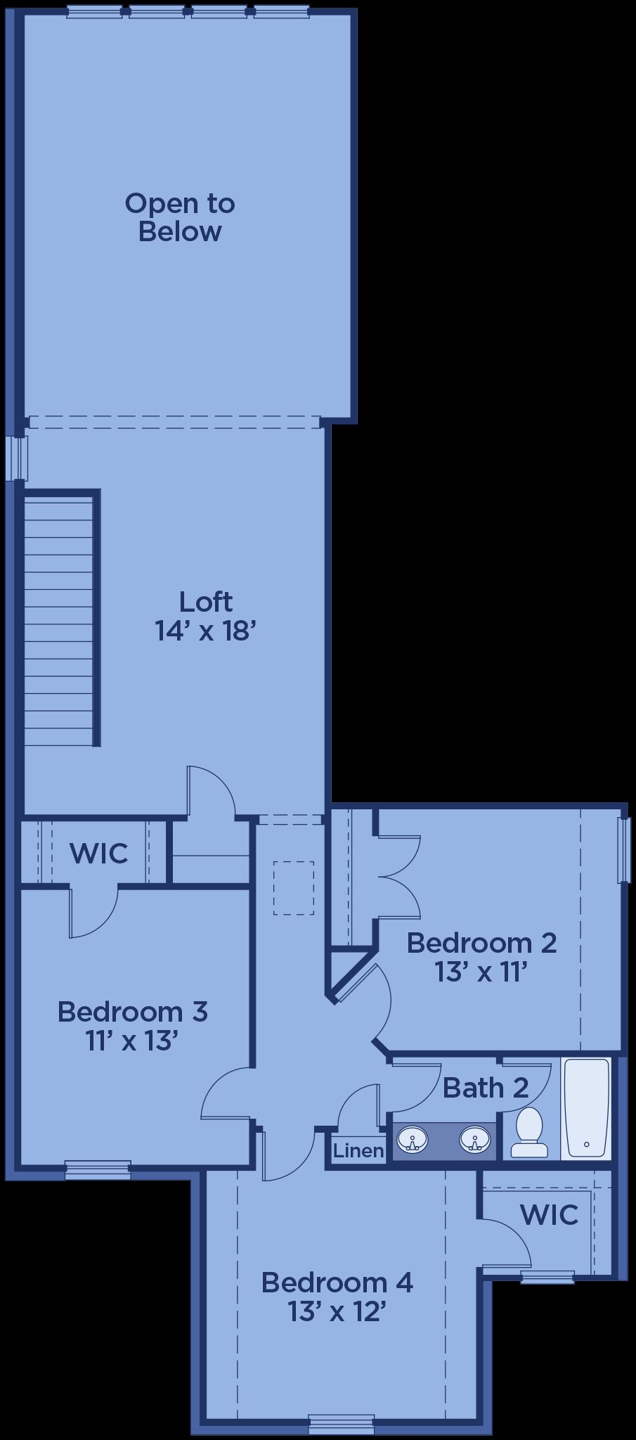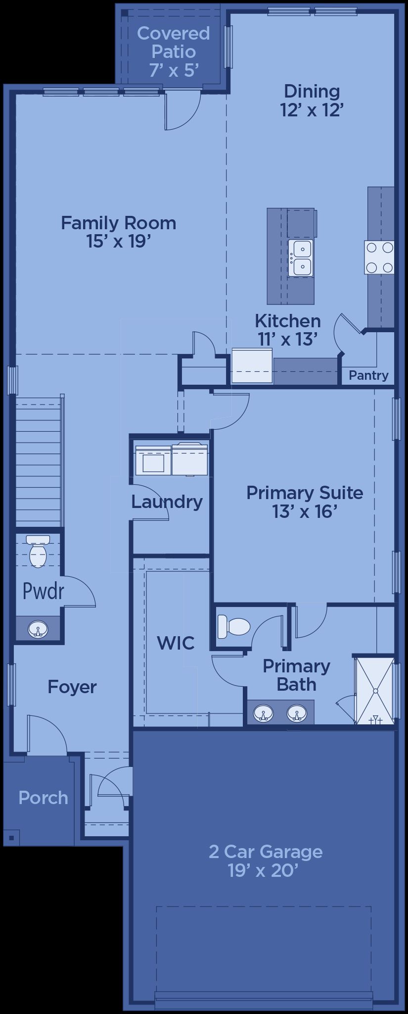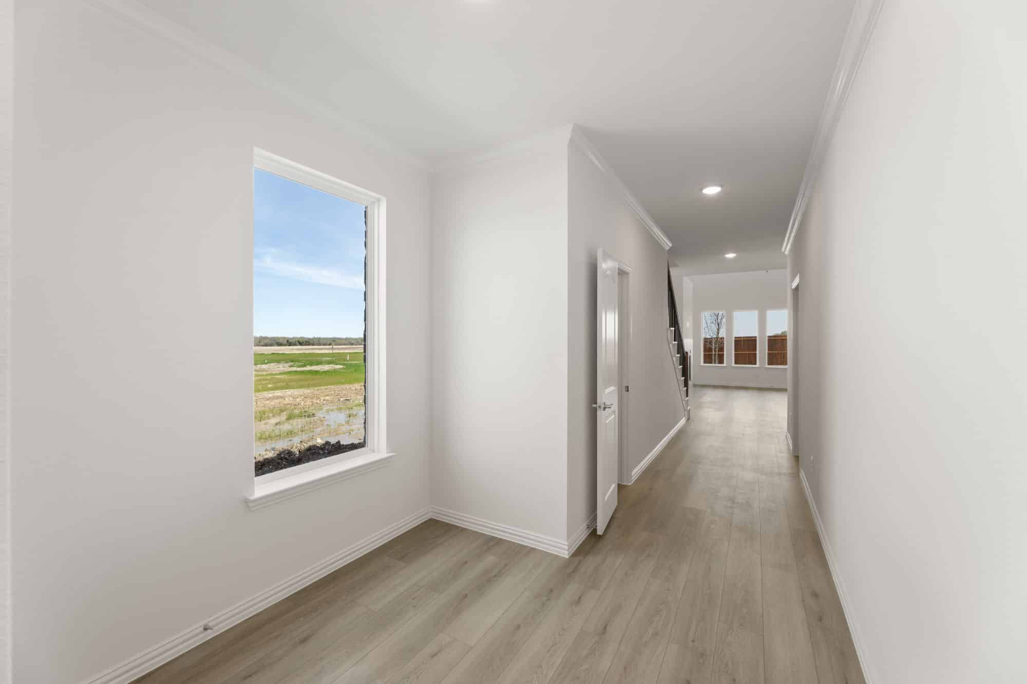 The Walton offers a well-designed two-story layout perfect for families and entertaining. A welcoming foyer—accessible from both the front door and garage—leads past a mudroom, laundry room, and powder bath into a spacious family room. The open-concept design flows seamlessly into the dining area and kitchen, which includes bar seating, ample counter space, a walk-in pantry, and direct access to a covered patio. The main-floor primary suite features a spa-style bath with double vanities, a soaking tub, glass shower, and a walk-in closet. Upstairs, an open loft overlooks the living space and connects to three secondary bedrooms—each with walk-in closets and shared access to a full bath with double sinks and a tub/shower combo.